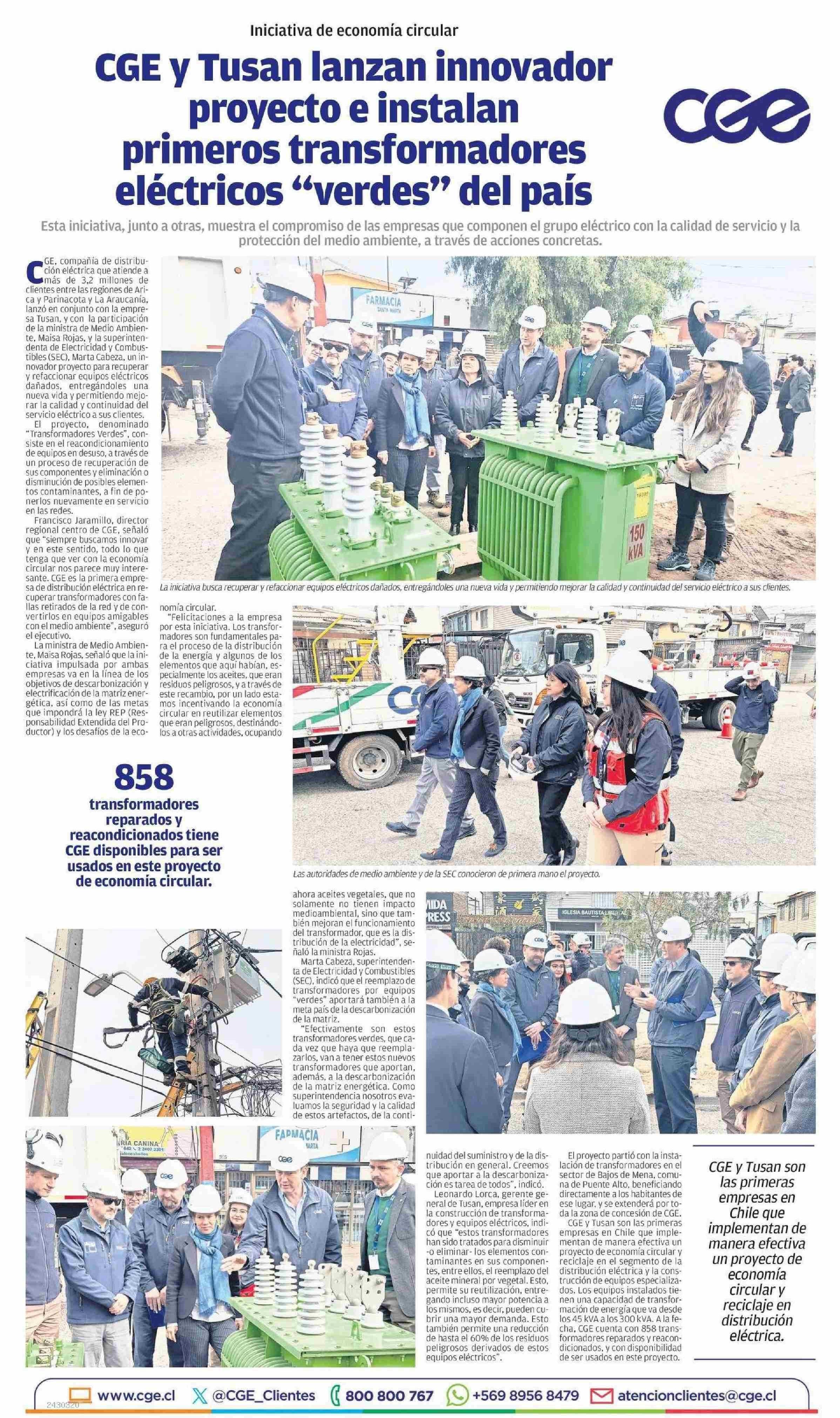 CGE y Tusan lanzan innovador proyecto e instalan primeros transformadores eléctricos “verdes” del país 12-06-2025 El Sur |