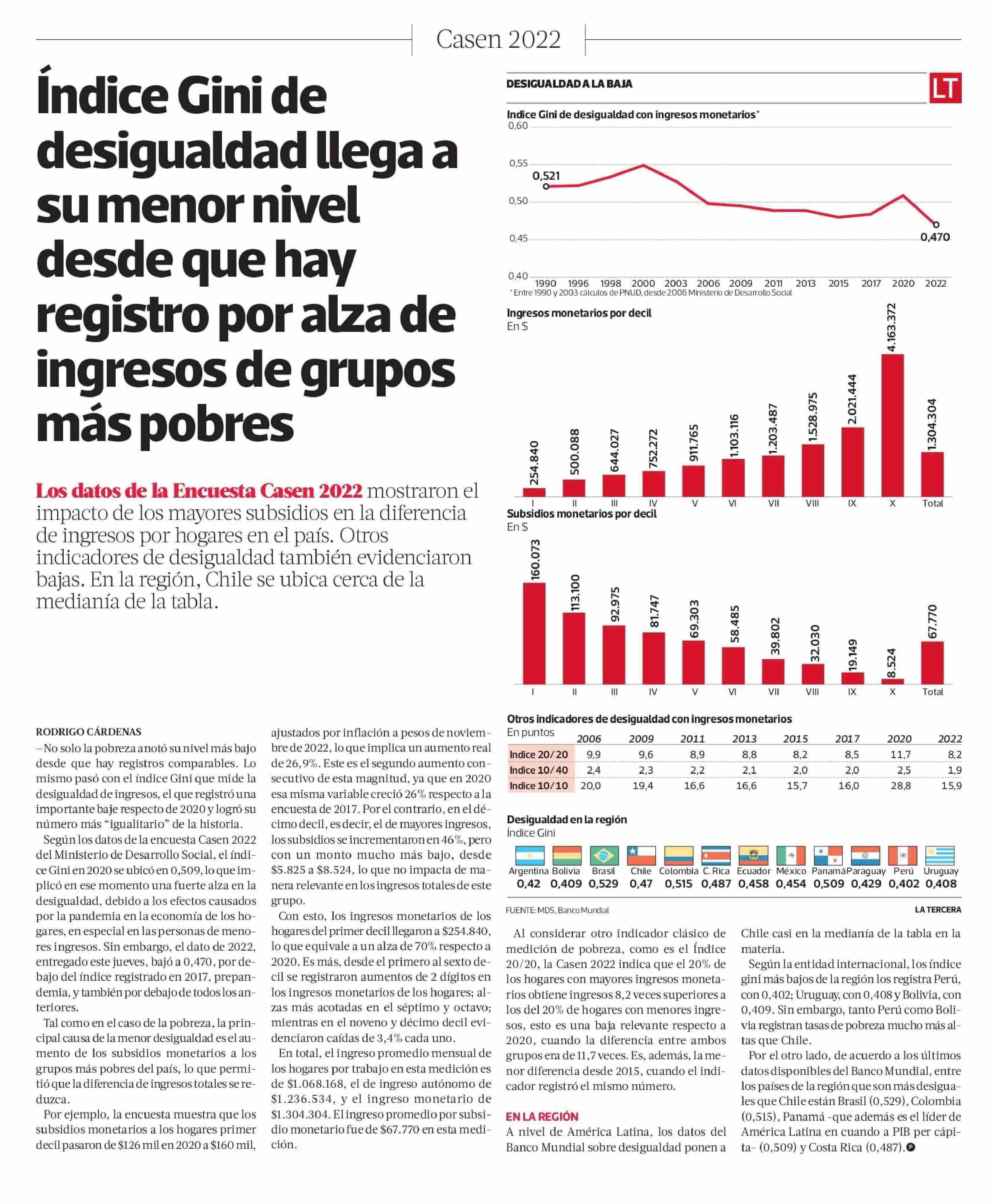 Índice Gini de desigualdad llega a su menor nivel desde que hay registro por alza de ingresos de grupos más pobres 28-07-2023 La Tercera |