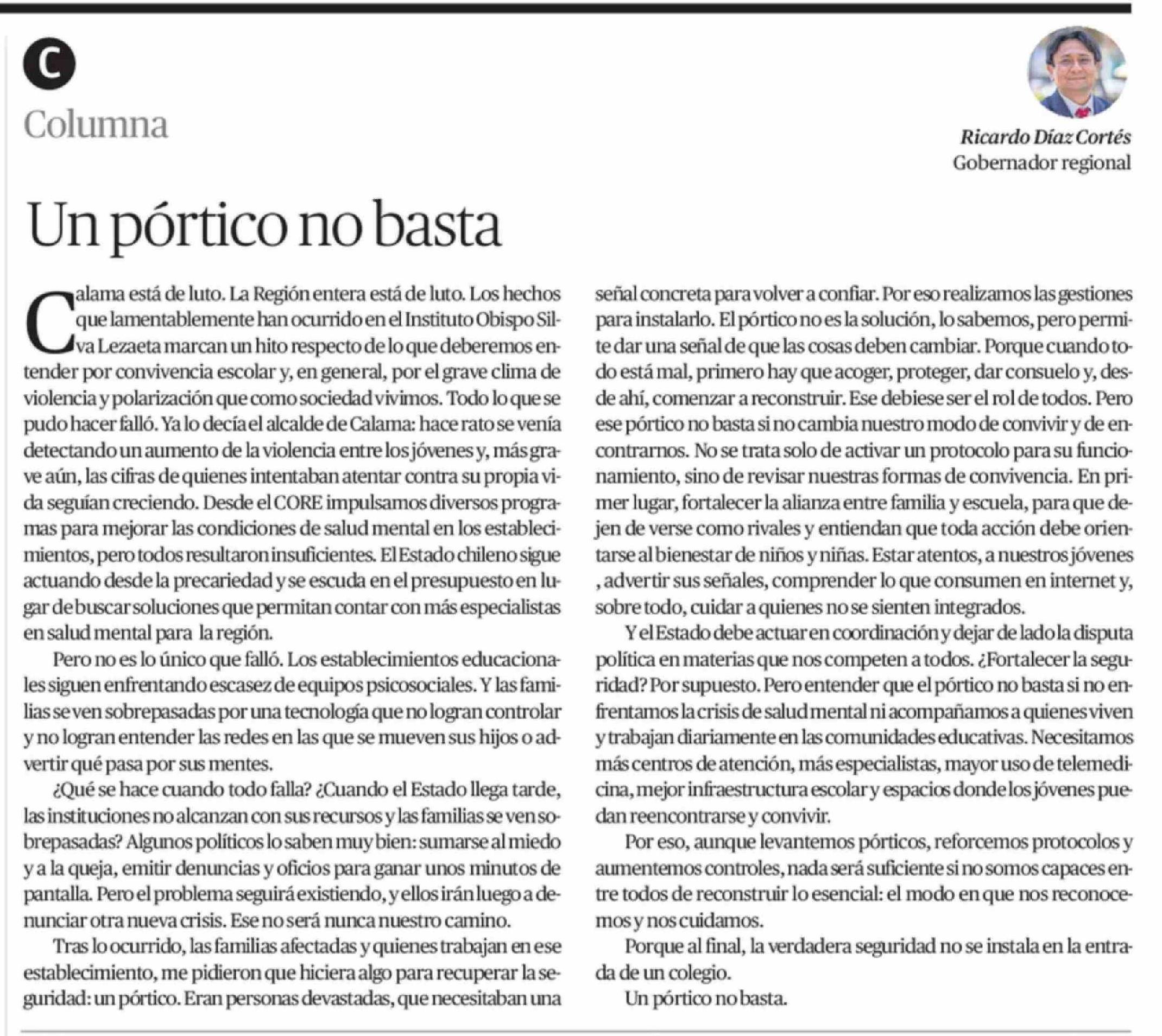 Columnas de Opinión: Un pórtico no basta 05-04-2026 El Mercurio de Antofagasta |