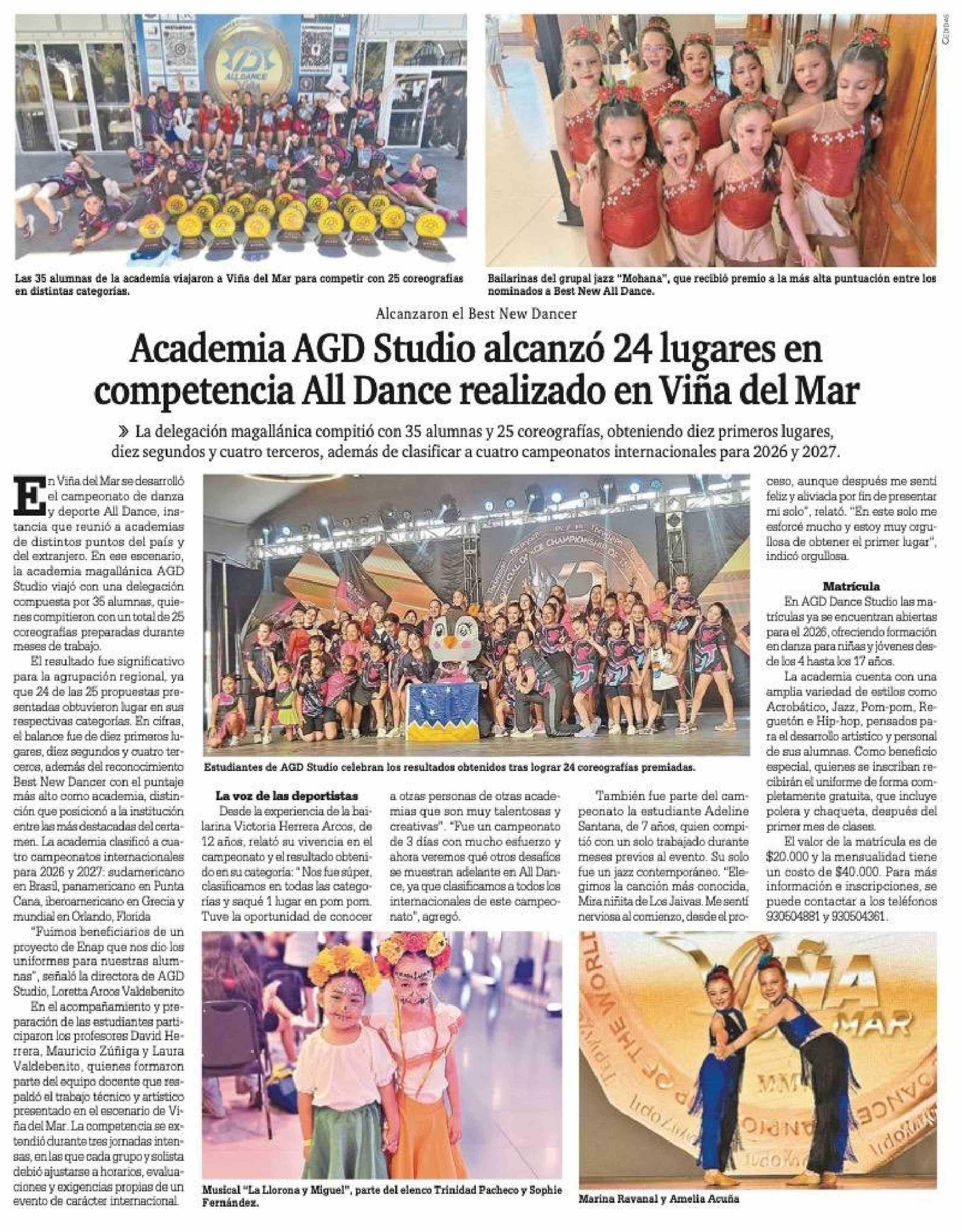 Academia AGD Studio alcanzó 24 lugares en competencia All Dance realizado en Viña del Mar 26-02-2026 La Prensa Austral |