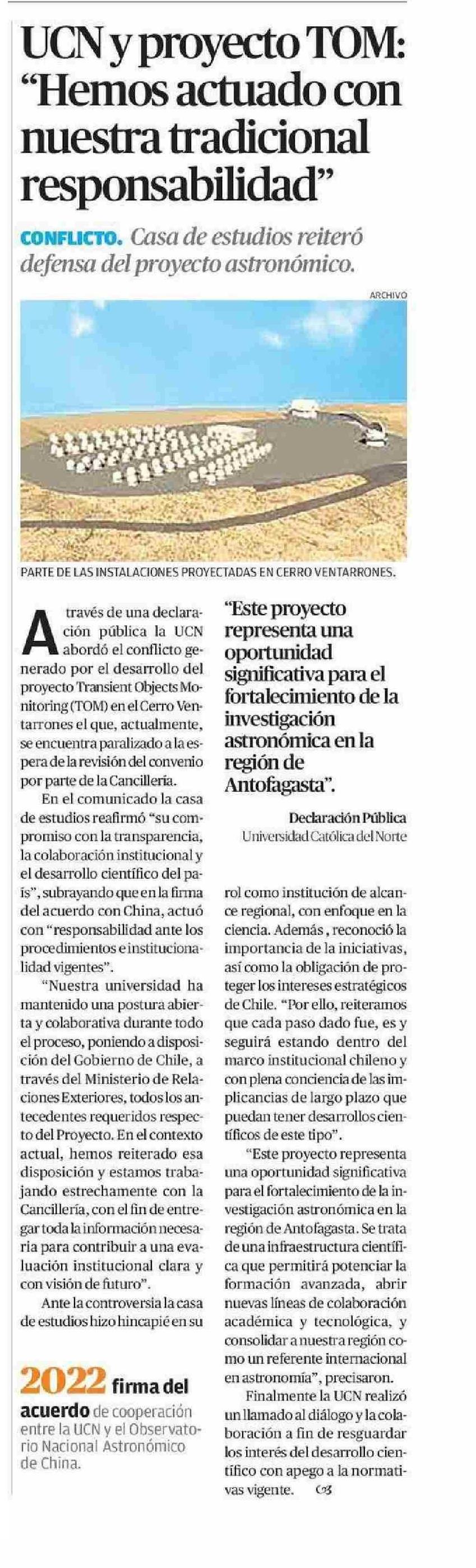 UCN y proyecto TOM: “Hemos actuado con nuestra tradicional responsabilidad” 25-04-2025 El Mercurio de Antofagasta |