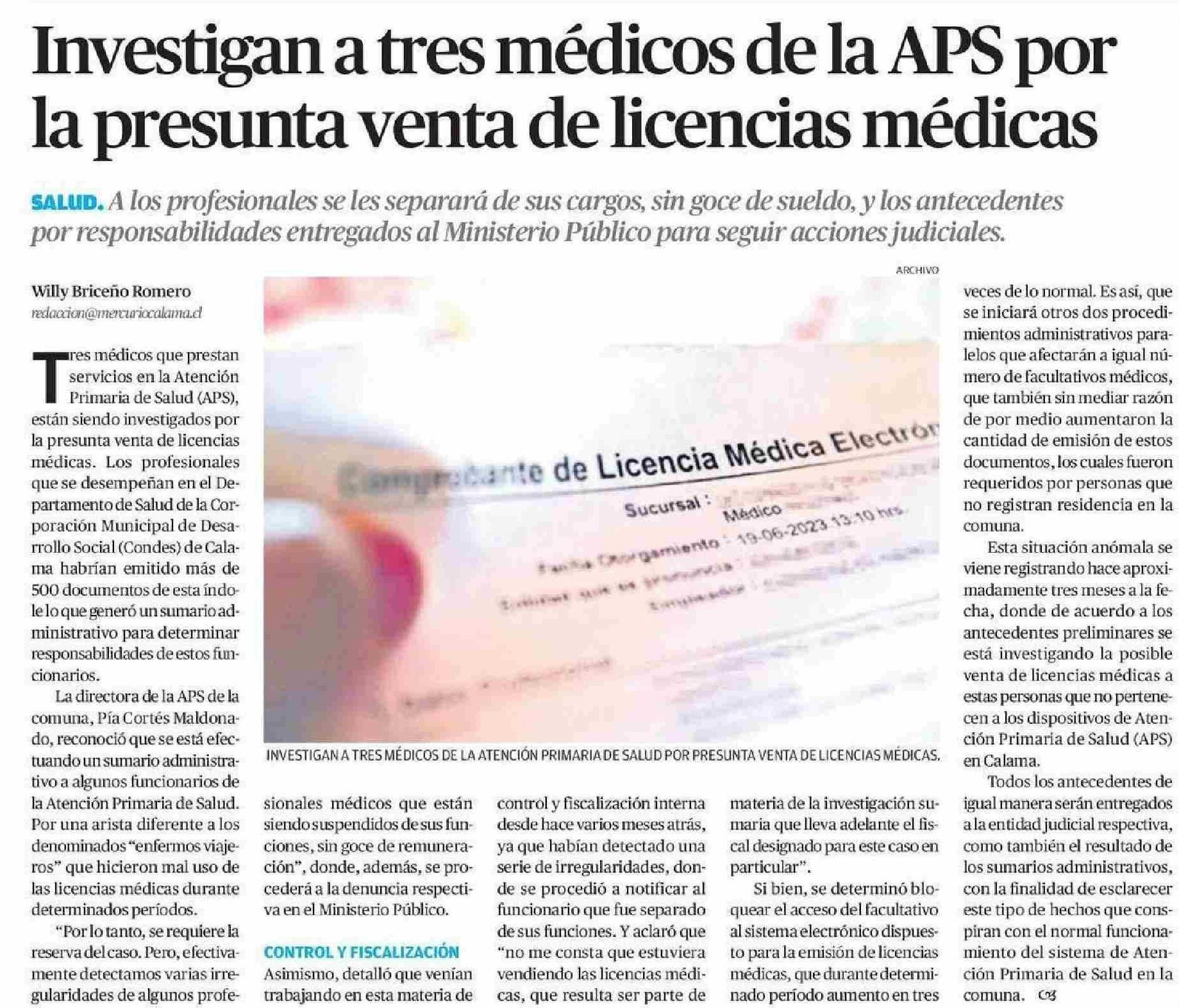 Investigan a tres médicos de la APS por la presunta venta de licencias médicas 30-05-2025 El Mercurio de Antofagasta |