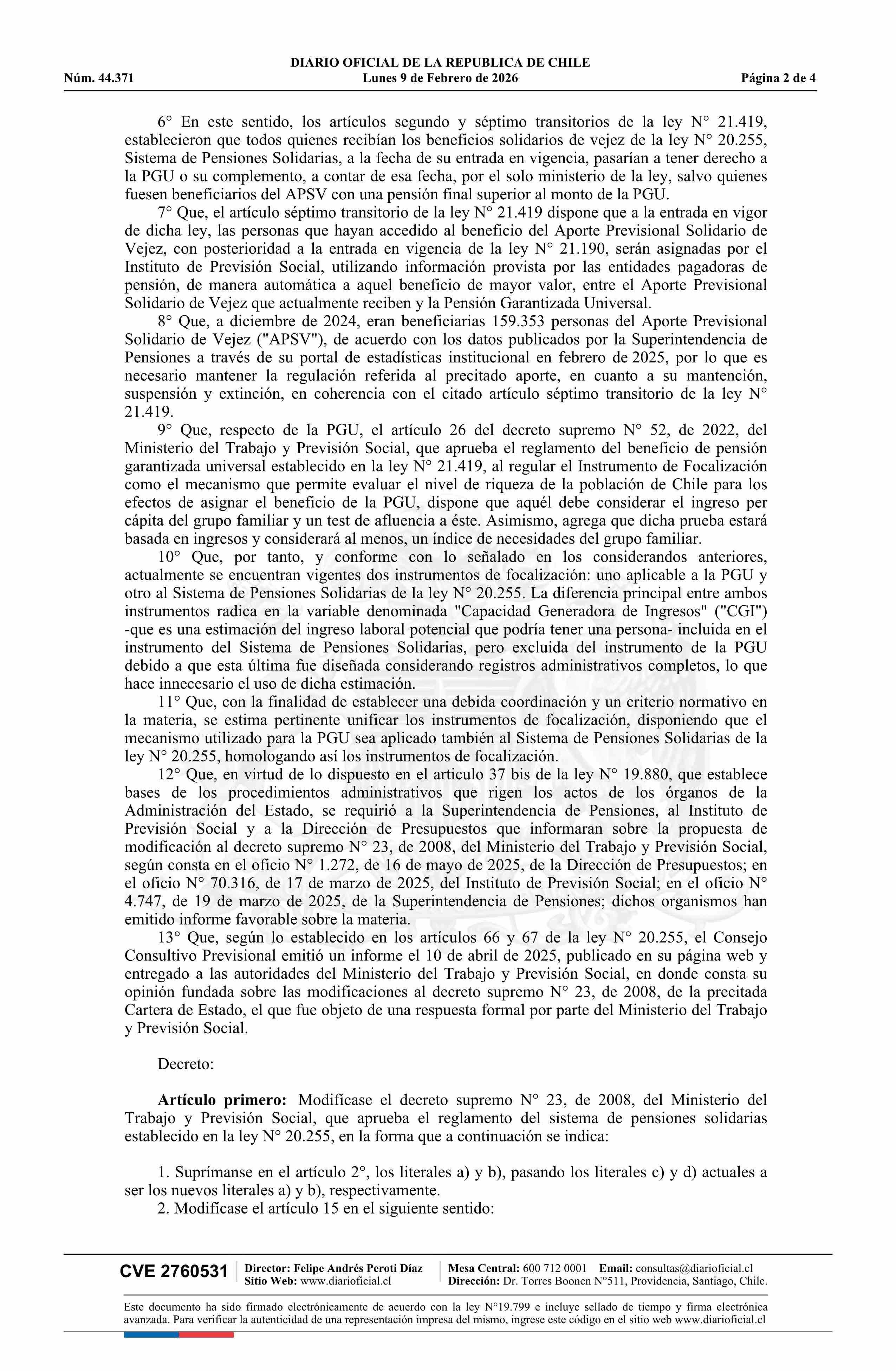 Decreto número 59, de 2025.- Modifica decreto N° 23, de 2008, que aprueba el Reglamento del Sistema de Pensiones Solidarias establecido en la ley N° 20.255 09-02-2026 Diario Oficial Edición Electrónica |