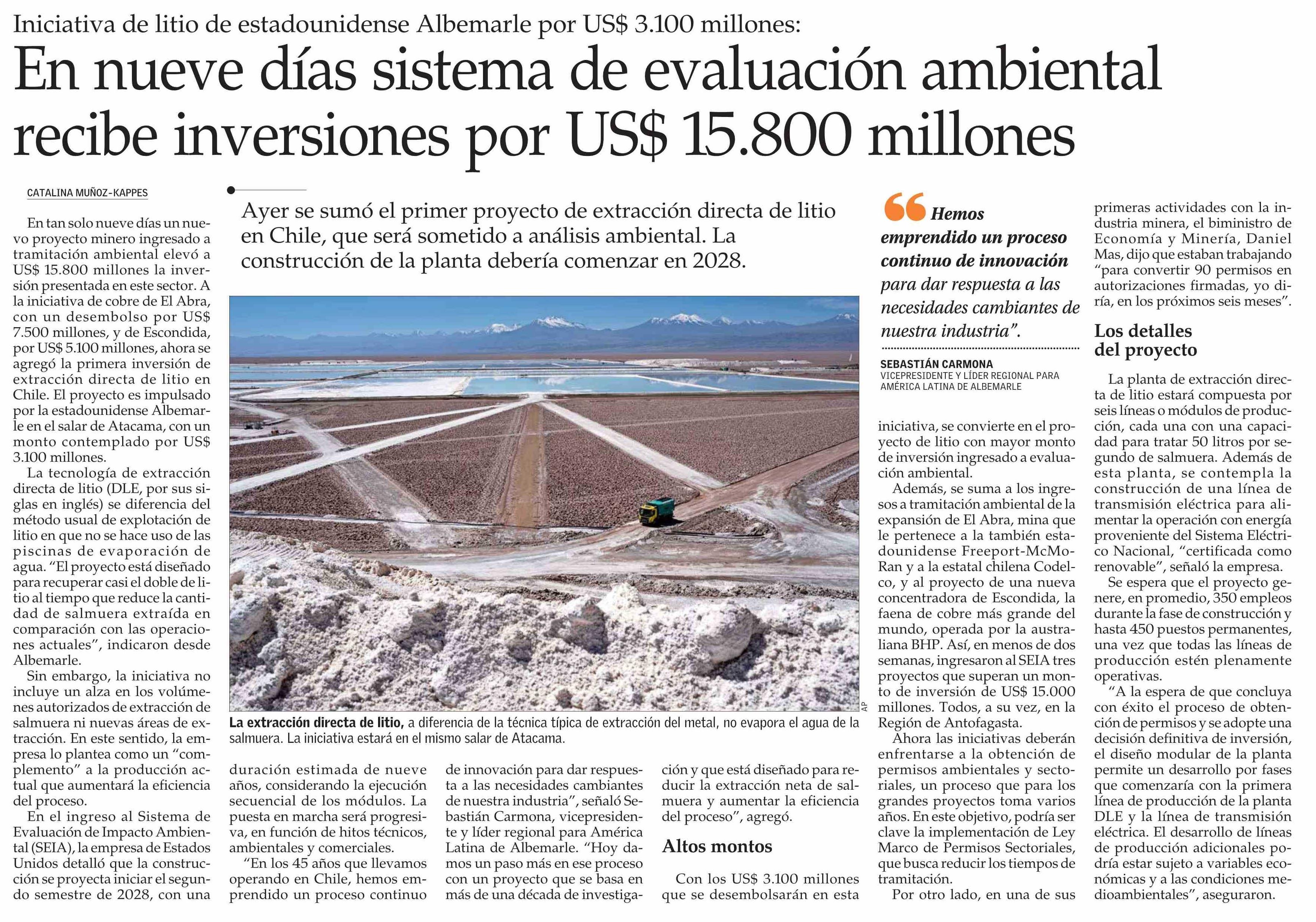 En nueve días sistema de evaluación ambiental recibe inversiones por US$ 15.800 millones 26-03-2026 El Mercurio |