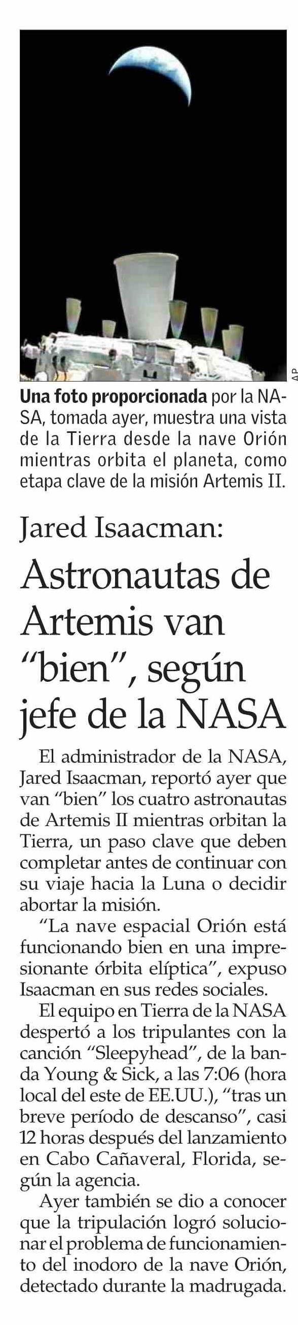 Título: Astronautas de Artemis van “bien”, según jefe de la NASA
