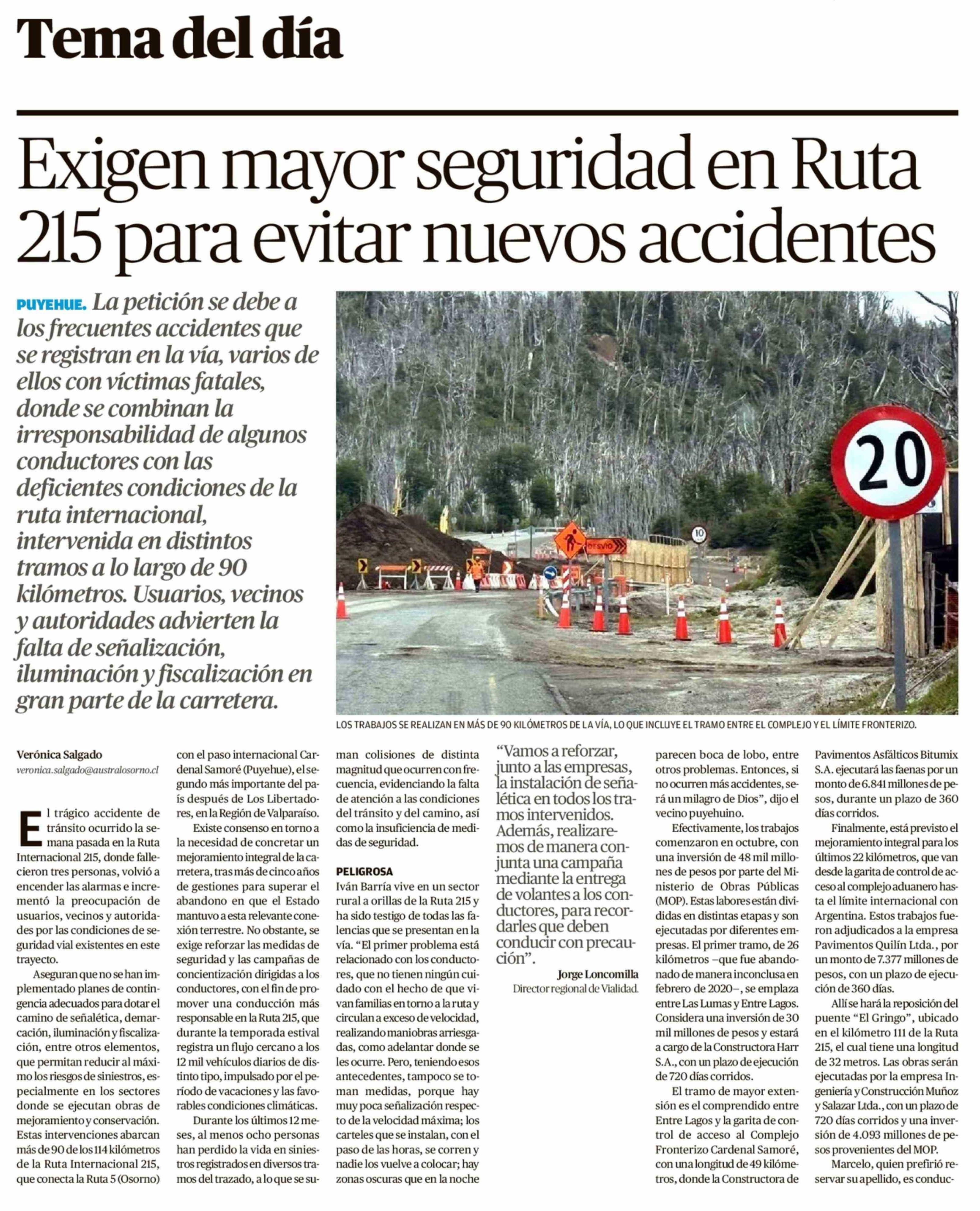 Exigen mayor seguridad en Ruta 215 para evitar nuevos accidentes 07-02-2026 El Austral de Osorno |