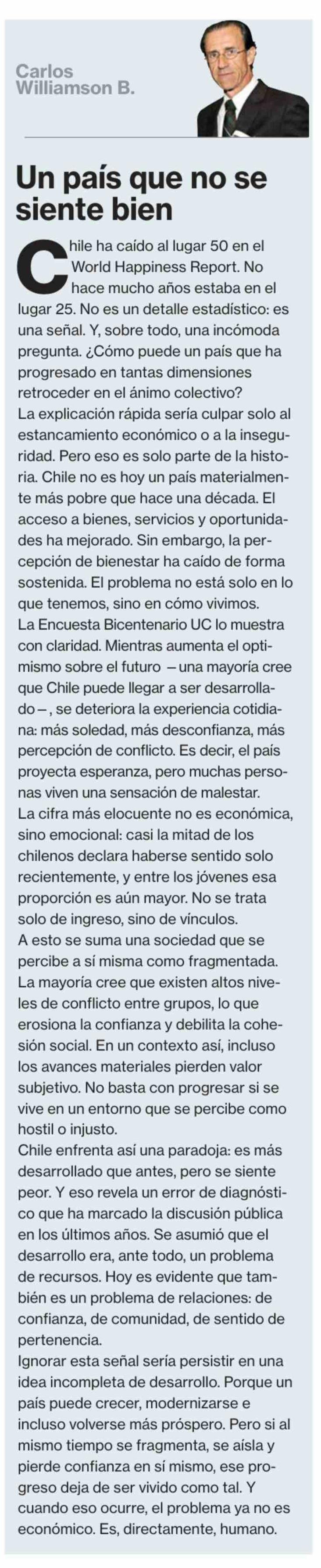 Columnas de Opinión: Un país que no se siente bien 31-03-2026 La Segunda |