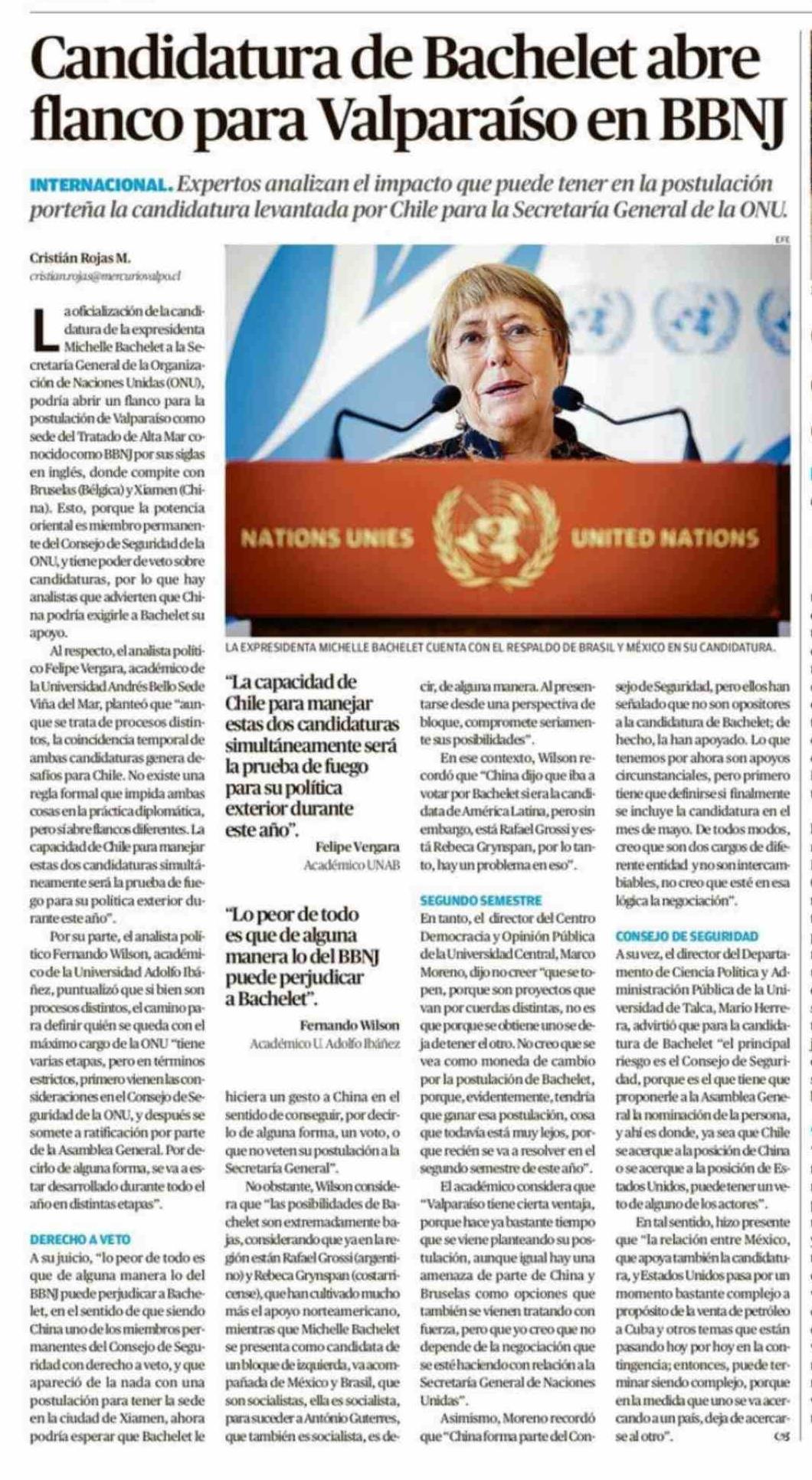 Título: Candidatura de Bachelet abre flanco para Valparaíso en BBNJ