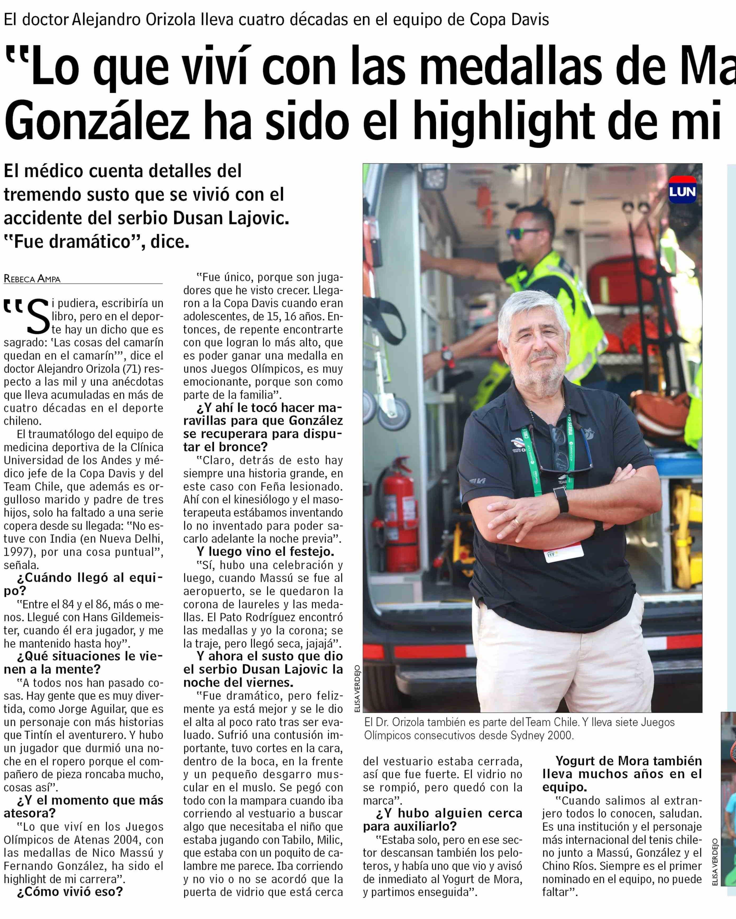 Título: libro, pero en el deporte hay un dicho que es sagrado: 'Las cosas del camarín quedan en el camarín"", dice el doctor Alejandro Orizola (71) respecto a las mil y una anécdotas que lleva acumuladas en más de cuatro décadas en el deporte chileno. El traumatólogo del equipo de medicina deportiva de la C