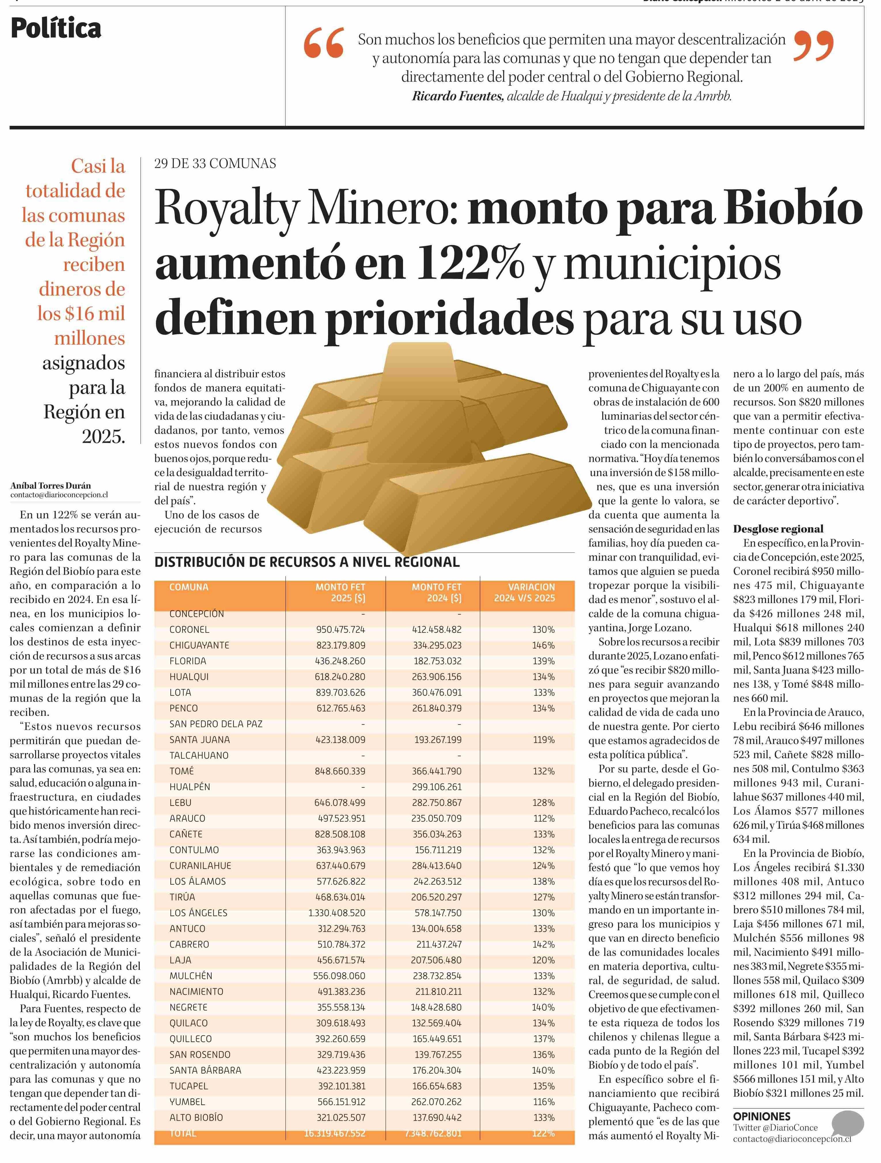 Royalty Minero: monto para Biobío aumentó en 122% y municipios definen prioridades para su uso 02-04-2025 Diario Concepción |