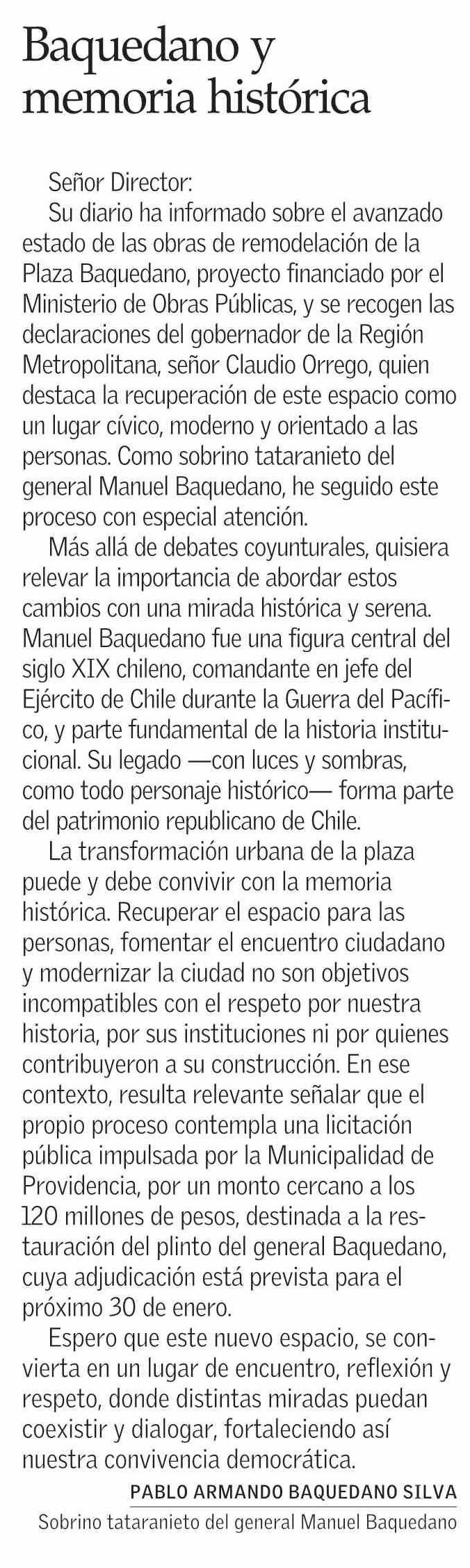 Cartas: Baquedano y memoria histórica 25-01-2026 El Mercurio |