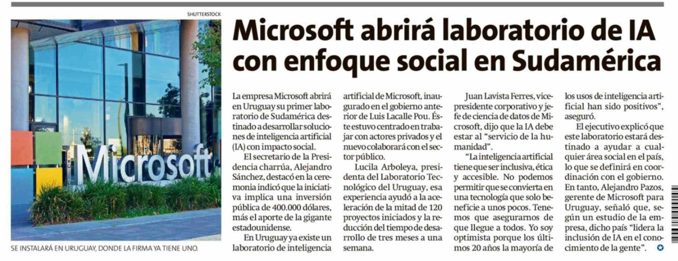 Título: Microsoft abrirá laboratorio de IA con enfoque social en Sudamérica