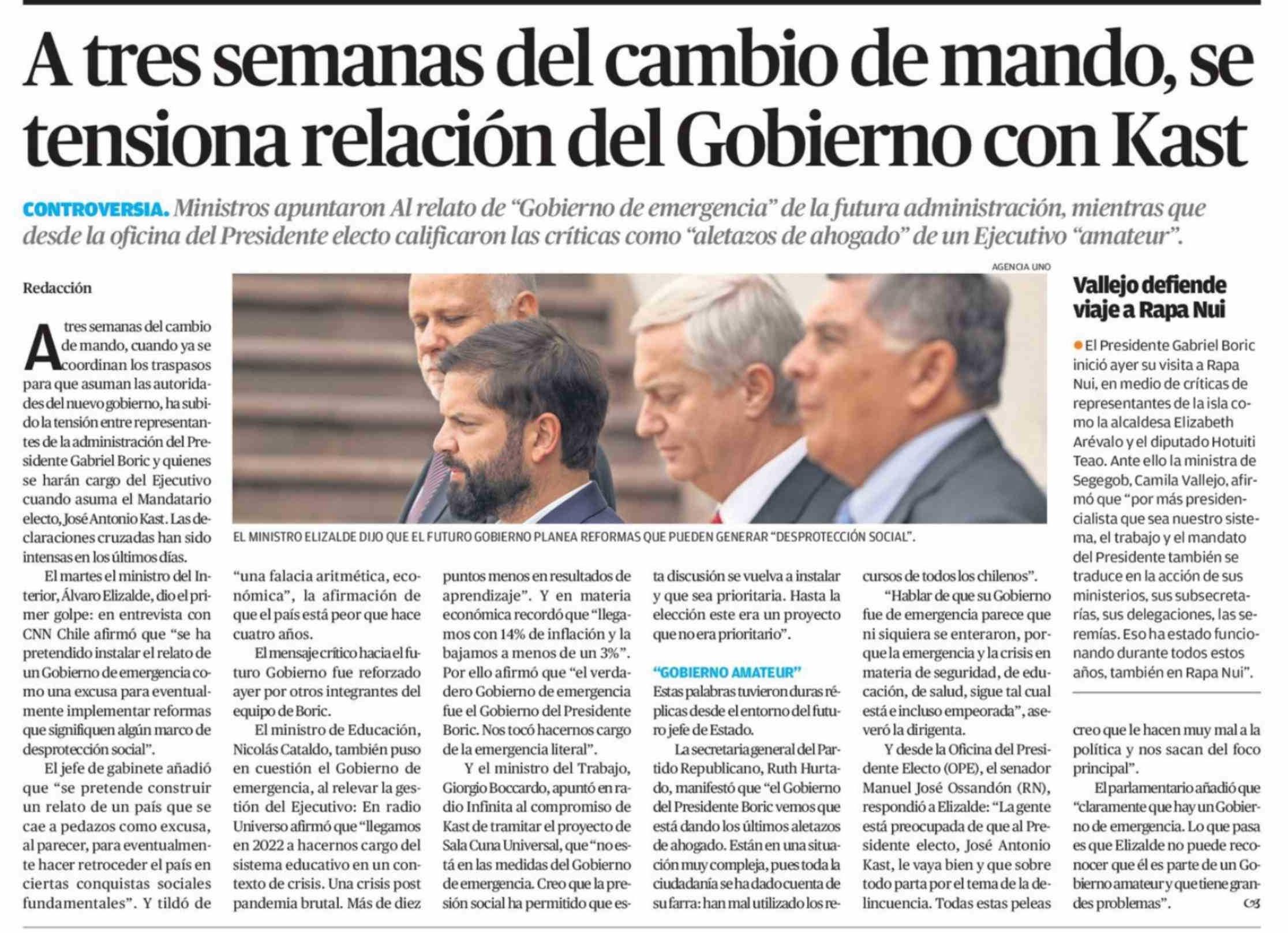 | Título: | A tres semanas del cambio de mando, se tensiona relación del Gobierno con Kast |