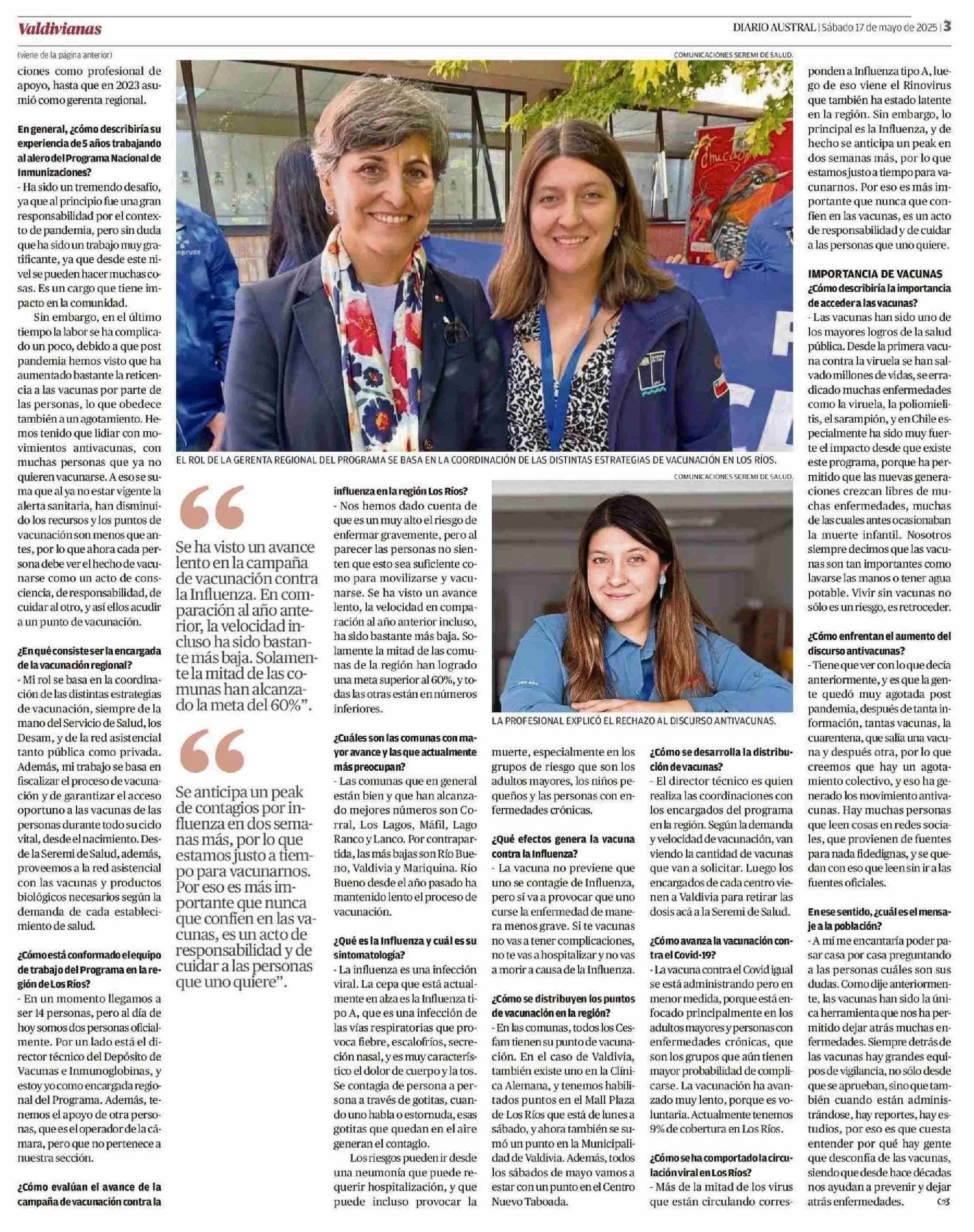 “Las vacunas son tan importantes como lavarse las manos y tener agua potable” 17-05-2025 Diario Austral Región de Los Ríos |