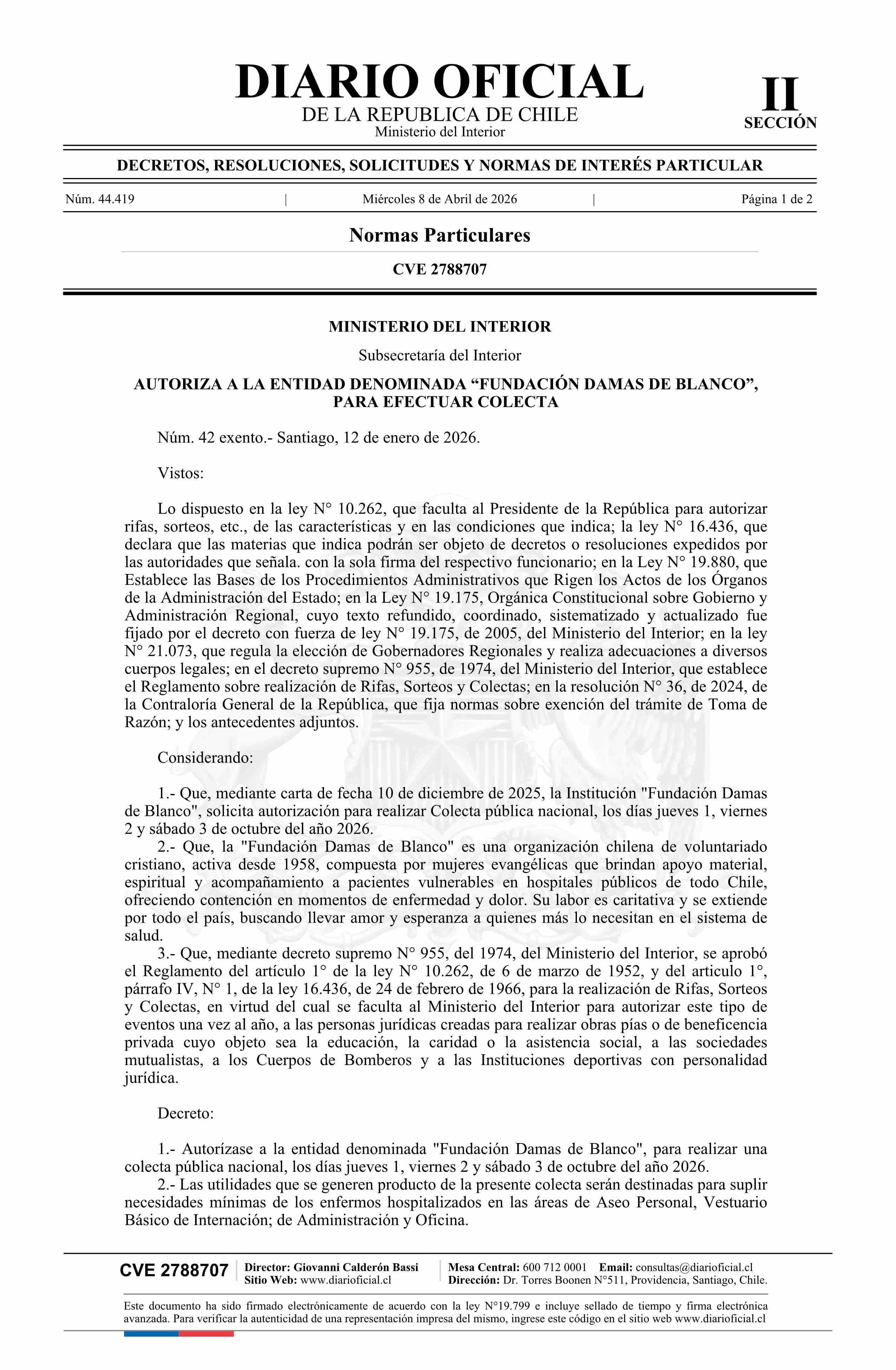 Decreto exento número 42, de 2026.- Autoriza a la entidad denominada Fundación Damas de Blanco, para efectuar colecta 08-04-2026 Diario Oficial Edición Electrónica |