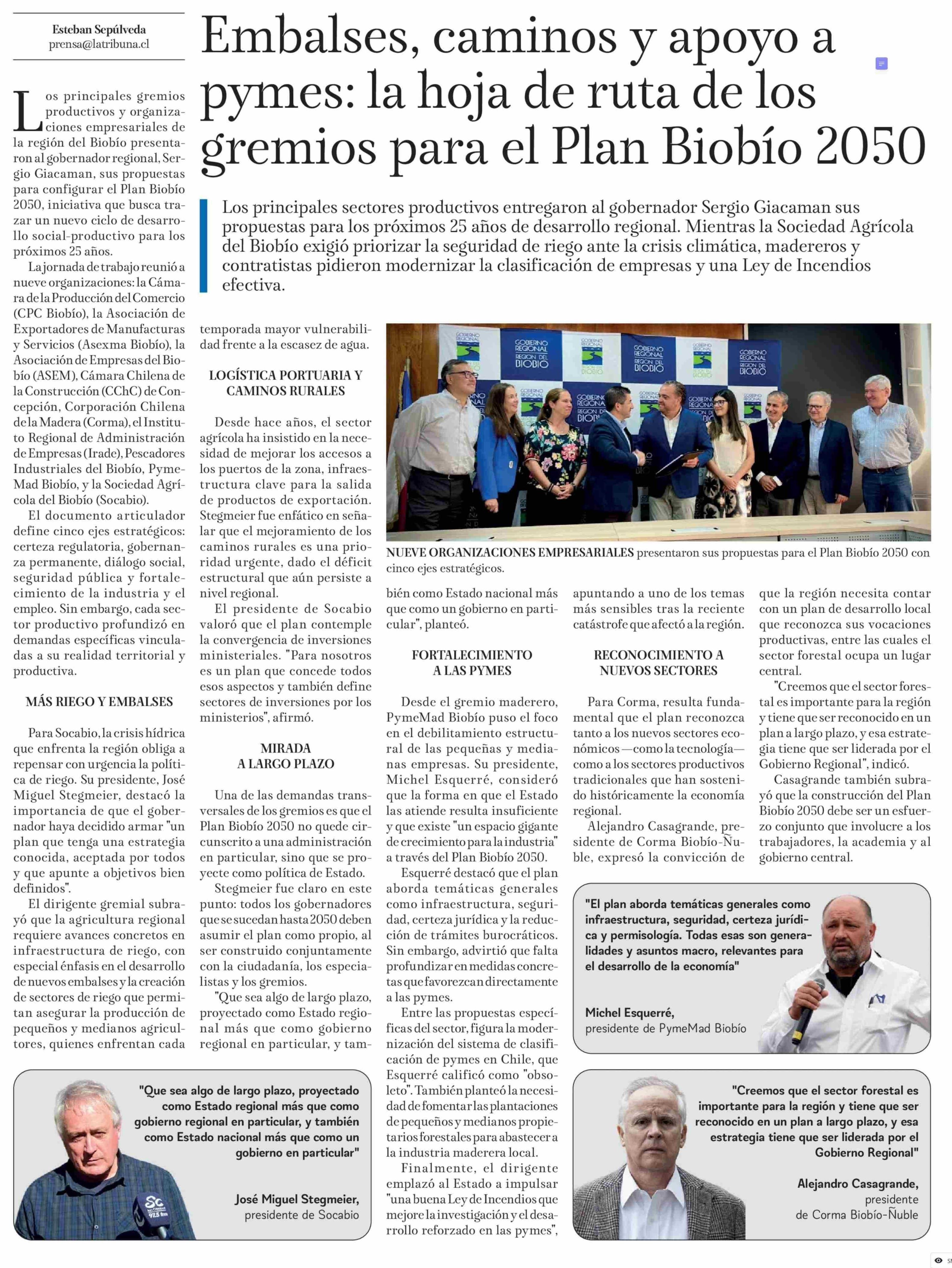 Embalses, caminos y apoyo a pymes: la hoja de ruta de los gremios para el Plan Biobío 2050 23-01-2026 La Tribuna |