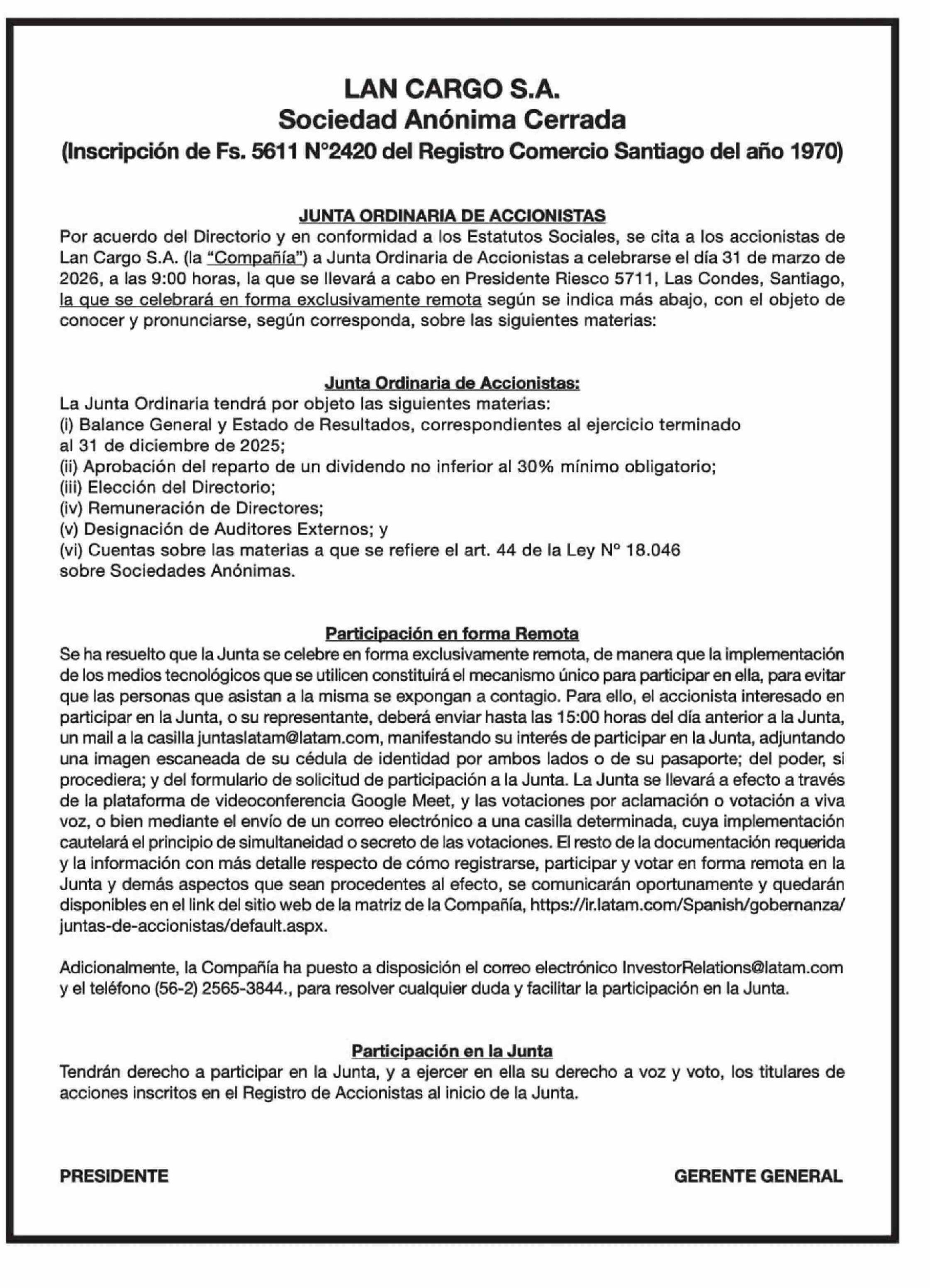 EXTRACTOS: LAN CARGO S.A.