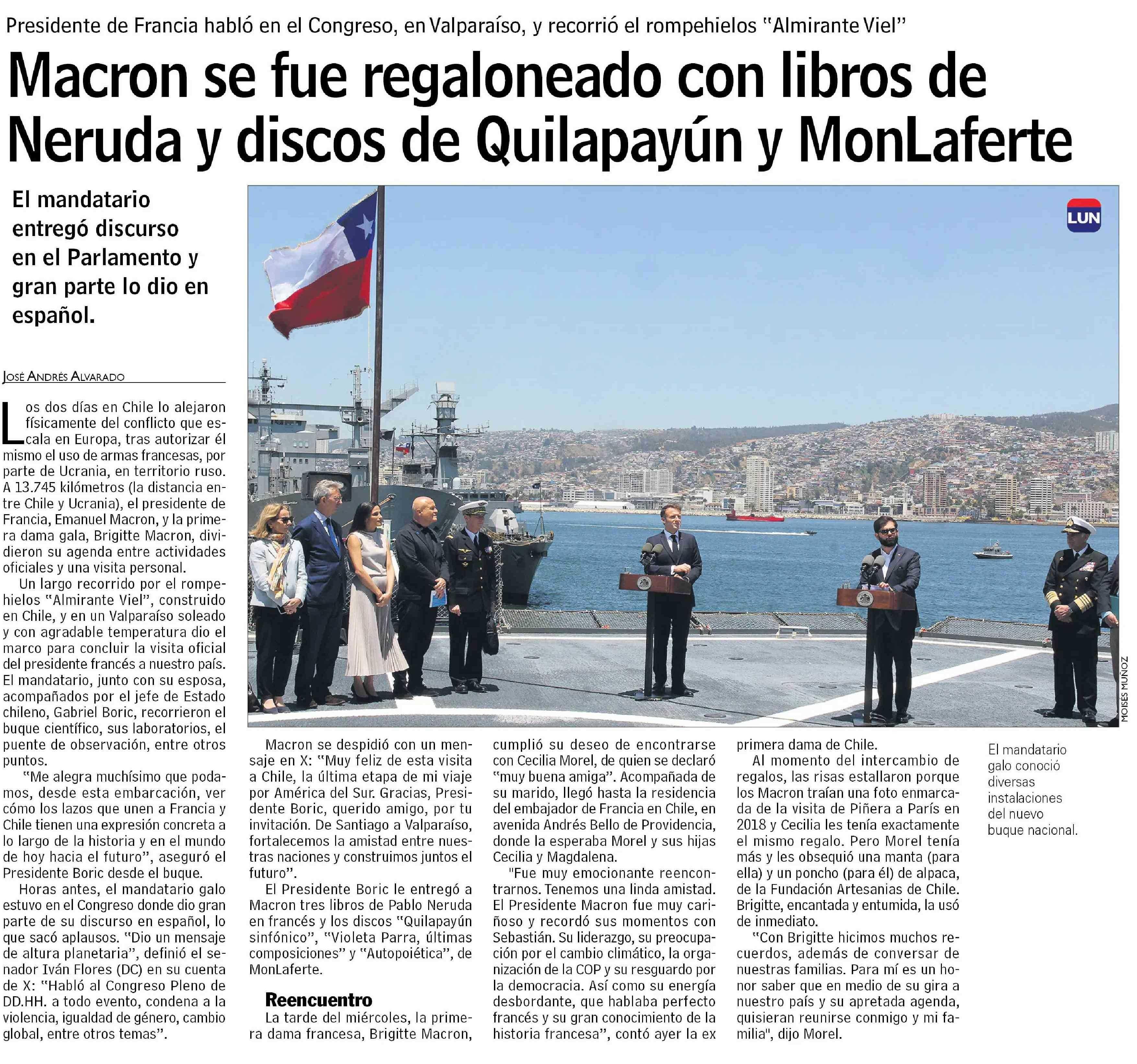 | Título: | Macron se fue regaloneado con libros de Neruda v discos de Quilapayún v MonLaferte |