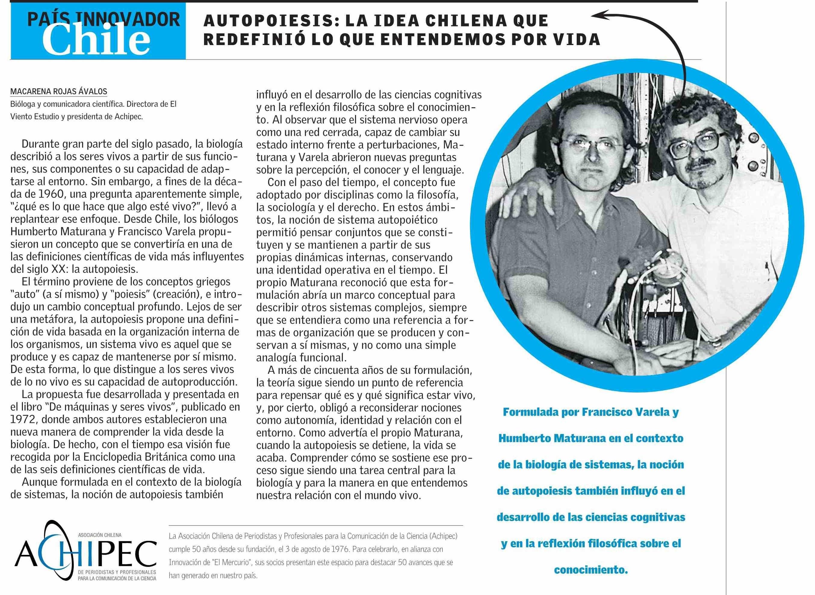 AUTOPOIESIS : LA IDEA CHILENA QUE REDEFINIÓ LO QUE ENTENDEMOS POR VIDA 15-01-2026 El Mercurio |