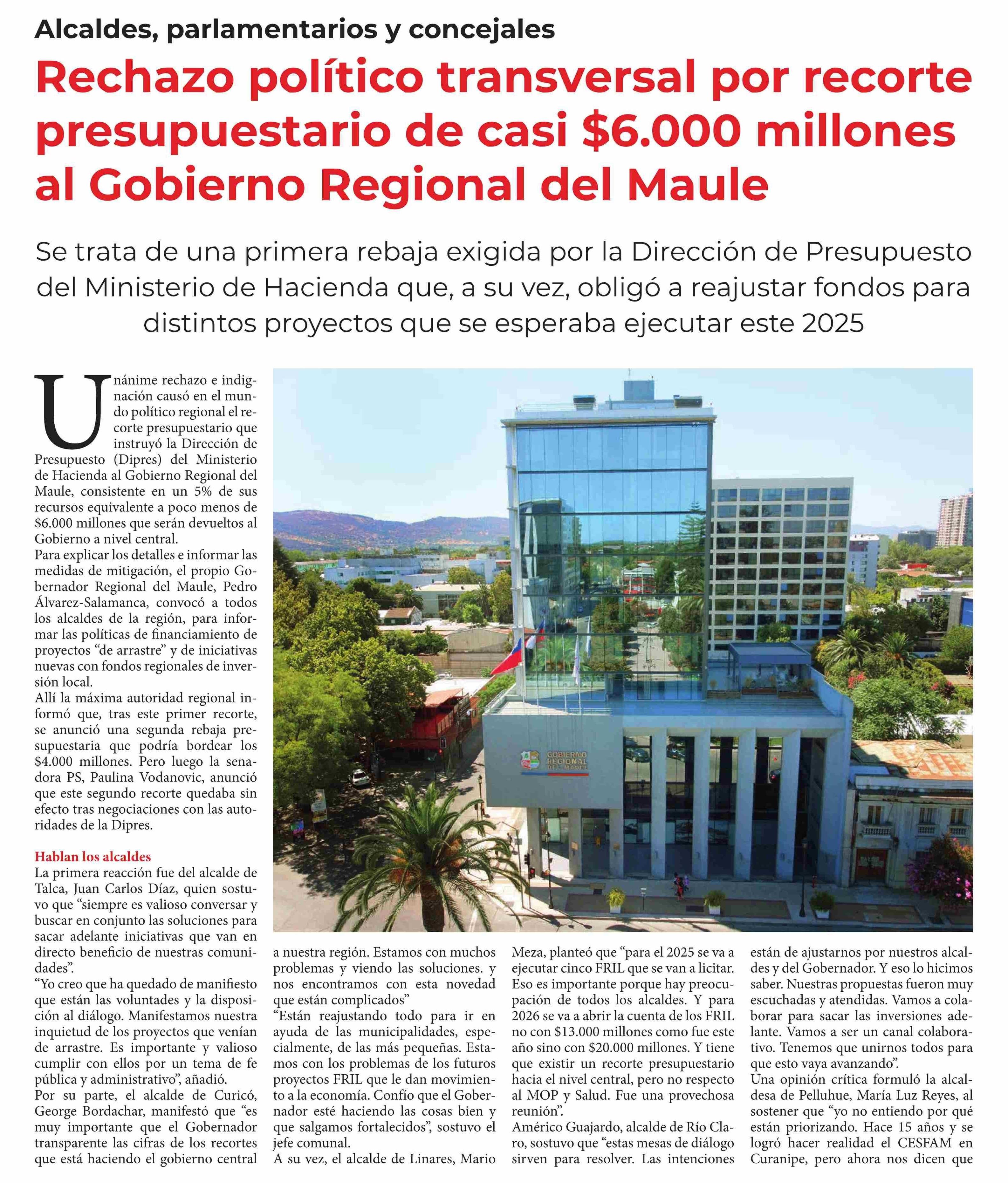 | Título: | Rechazo político transversal por recorte presupuestario de casi $6.000 millones al Gobierno Regional del Maule |