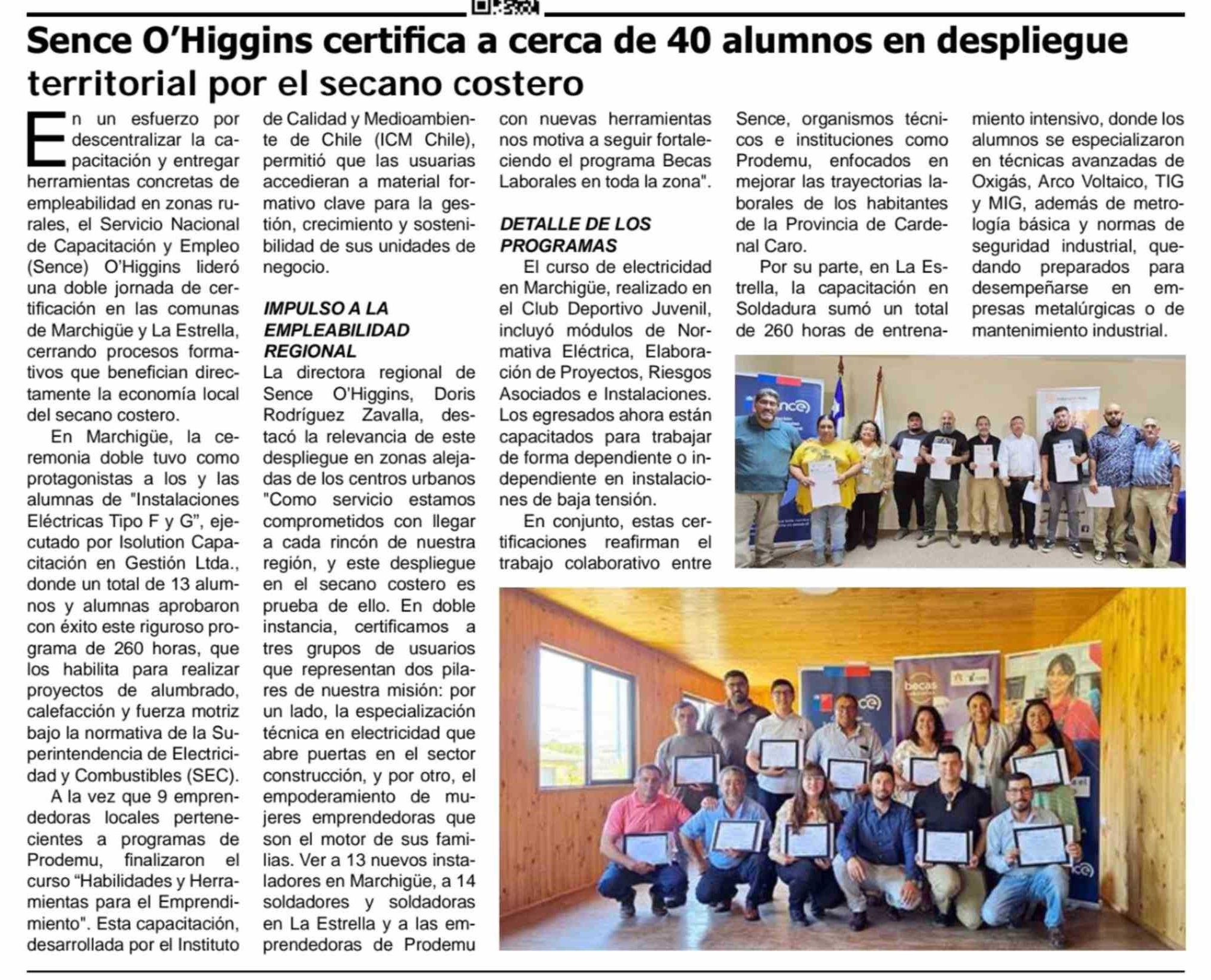 Título: Sence O'Higgins certifica a cerca de 40 alumnos en despliegue territorial por el secano costero