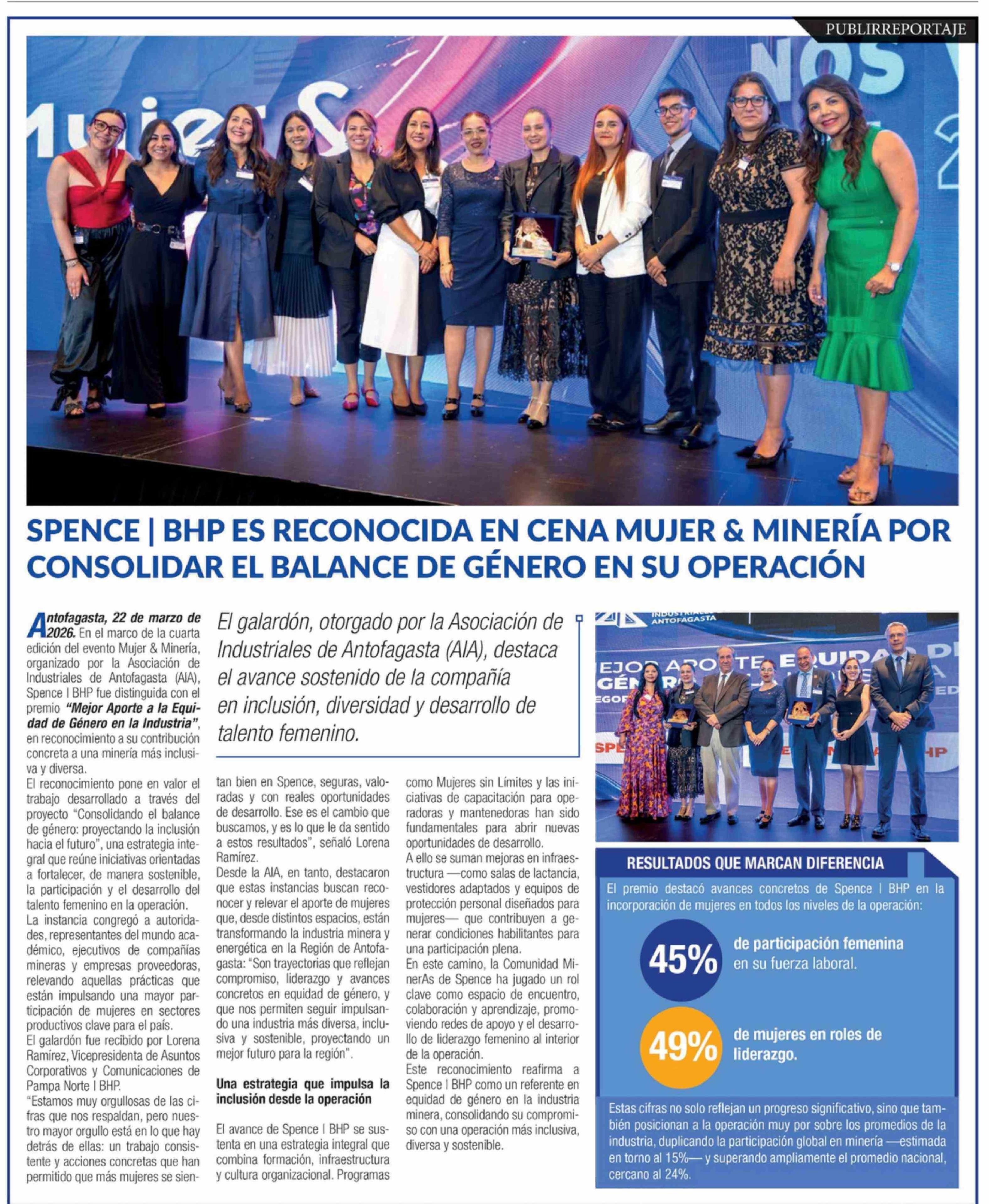 Título: SPENCE | BHP ES RECONOCIDA EN CENA MUJER & MINERÍA POR CONSOLIDAR EL BALANCE DE GÉNERO EN SU OPERACIÓN