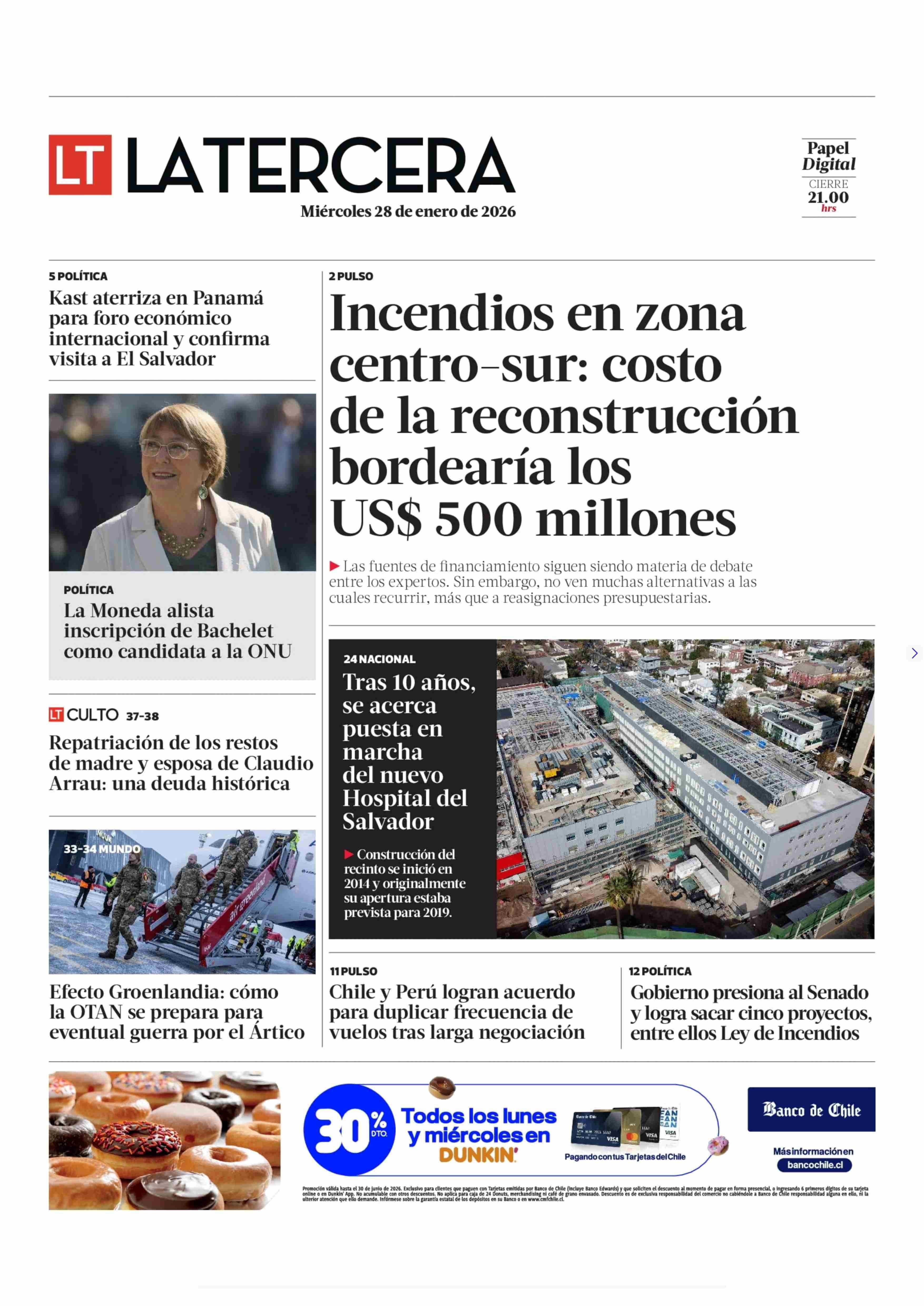 PORTADA LA TERCERA CHILE 28-01-2026 La Tercera |