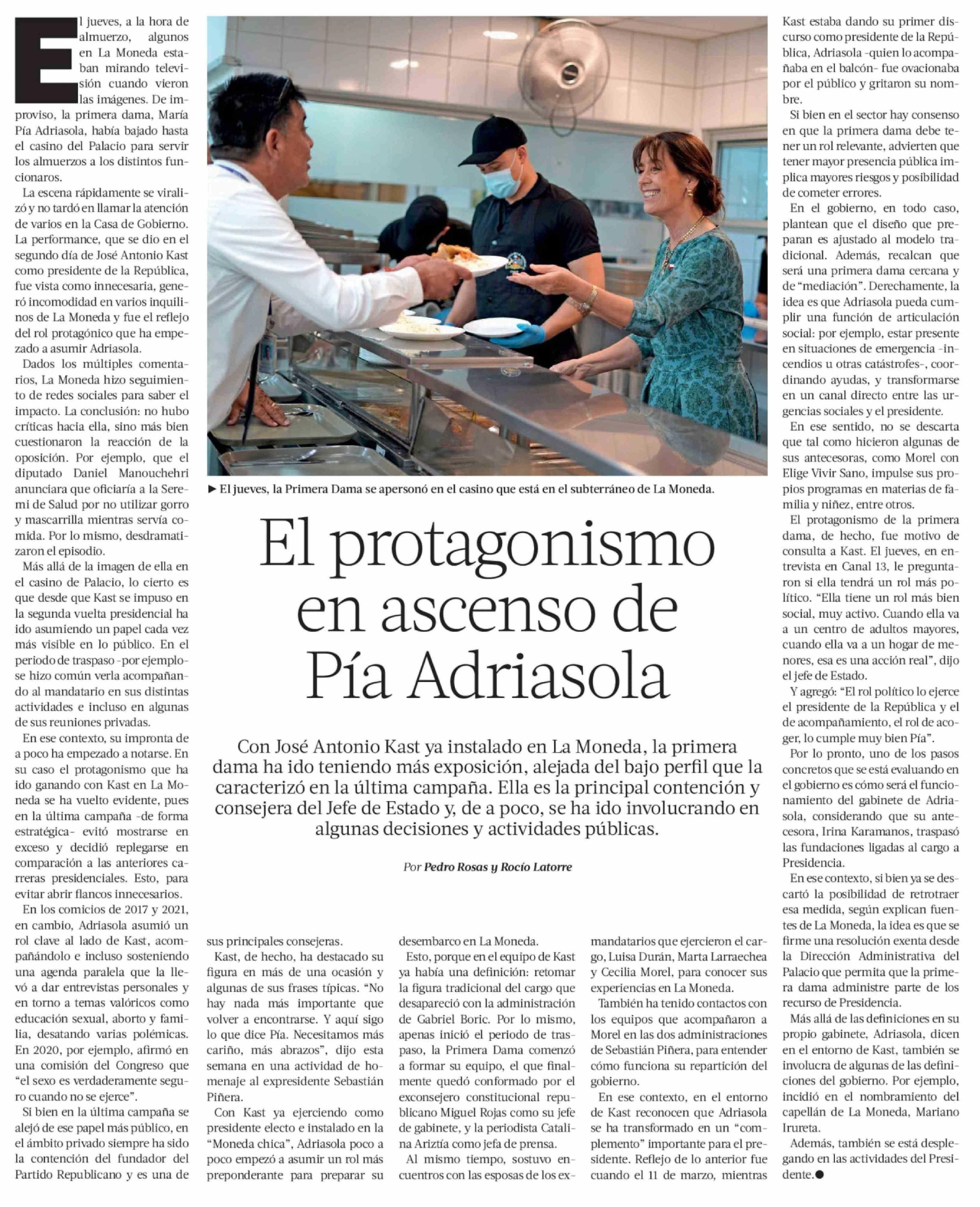 El protagonismo en ascenso de Pía Adriasola 14-03-2026 La Tercera |