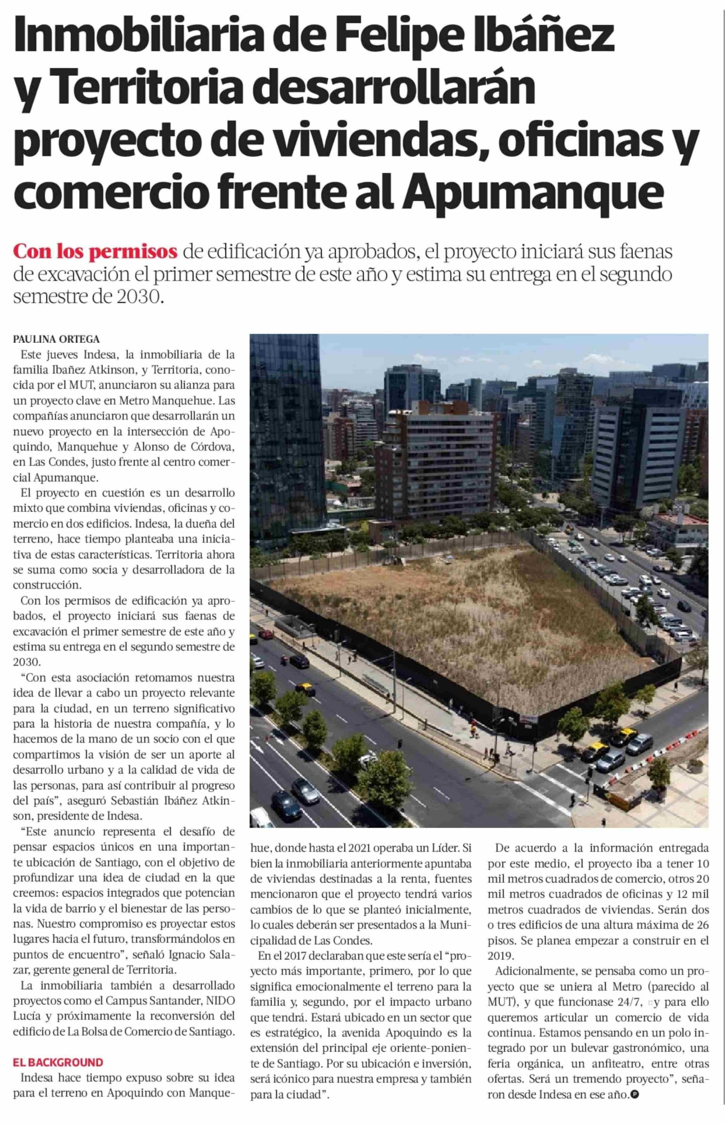 Título: Inmobiliaria de Felipe Ibáñez y Territoria desarrollarán proyecto de viviendas, oficinas y comercio frente al Apumanque