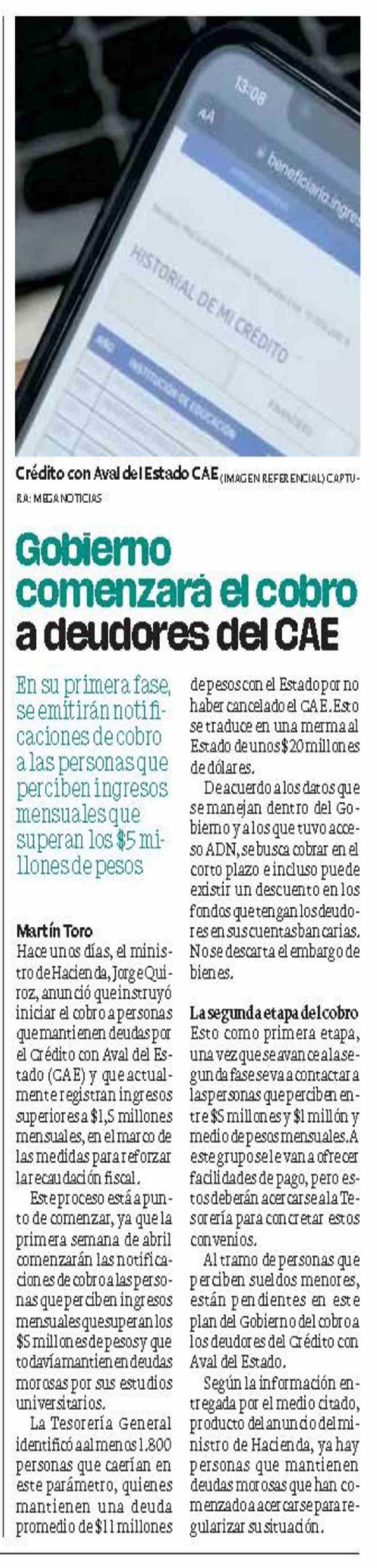 Gobierno comenzará el cobro a deudores del CAE 30-03-2026 Publimetro |