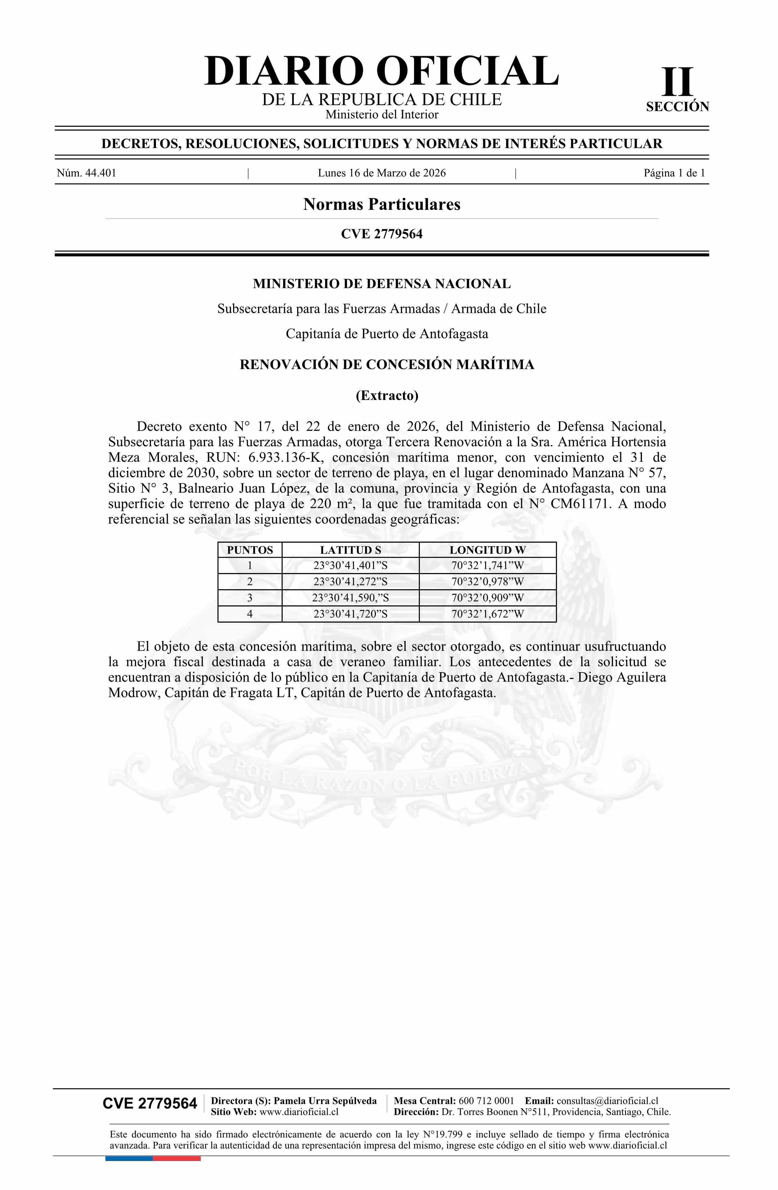 Título: Extracto de decreto exento número 17, de 2026.- Renovación de concesión marítima