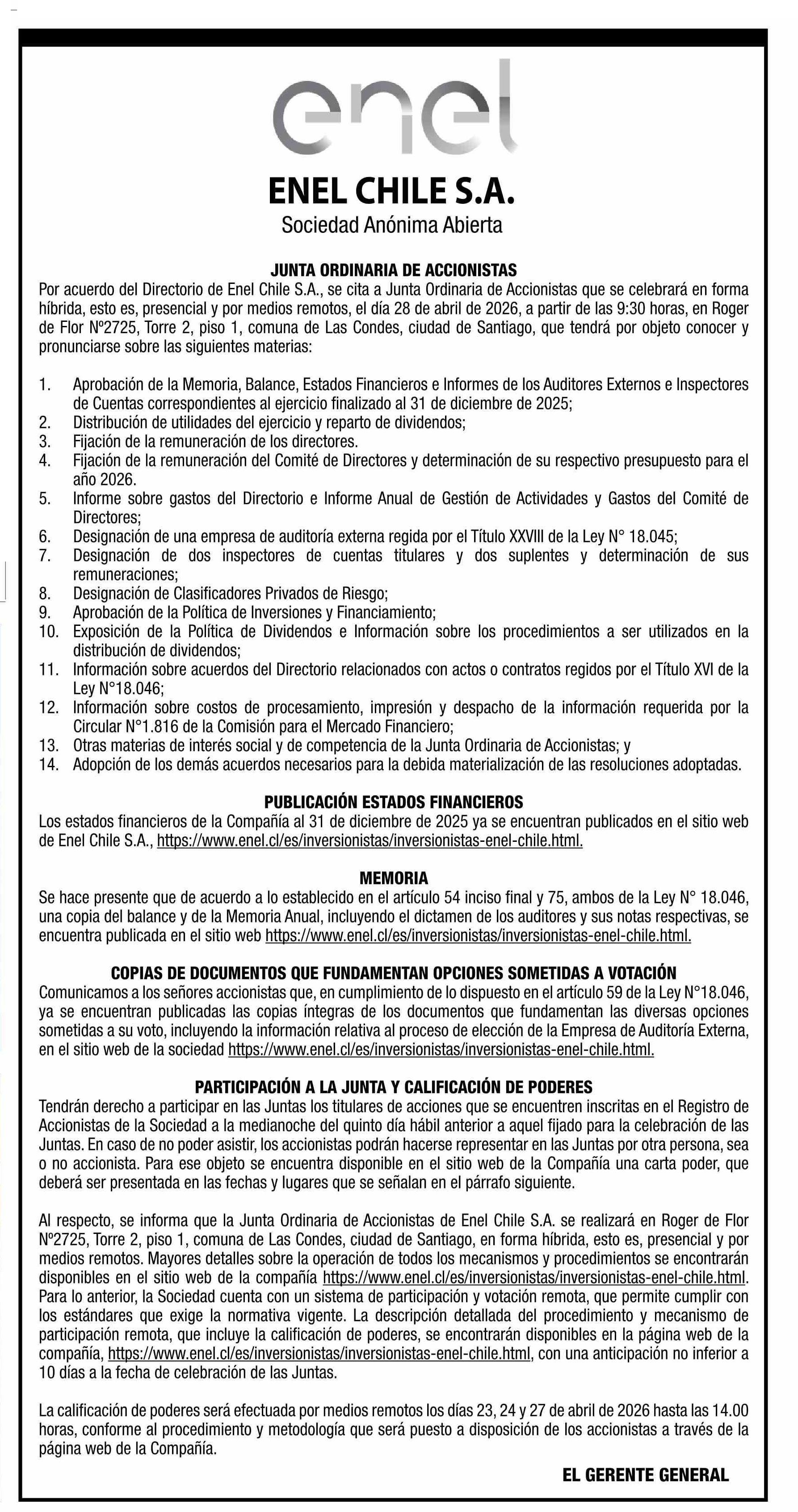 EXTRACTOS: ENEL CHILE S.A. 18-04-2026 El Mercurio |