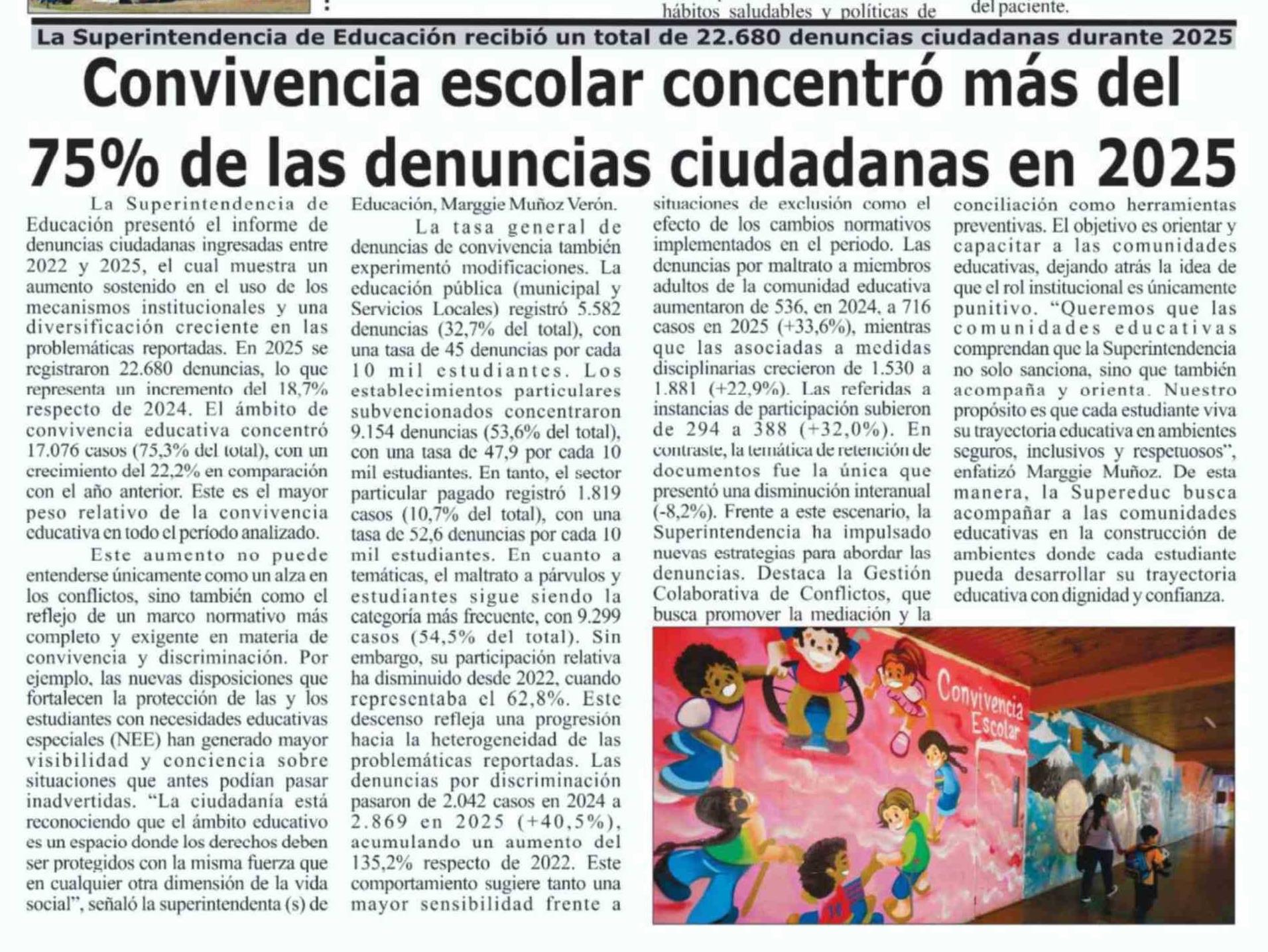 Título: Convivencia escolar concentró más del 75% de las denuncias ciudadanas en 2025