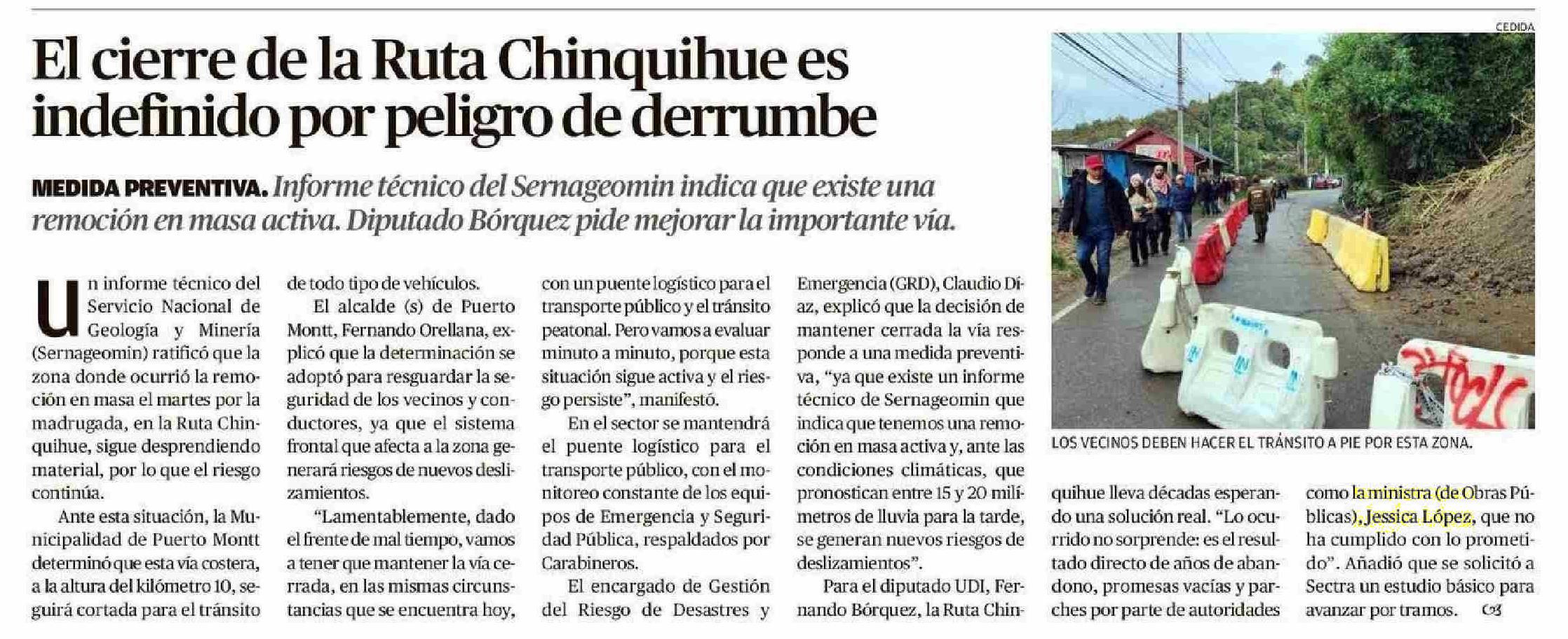 Título: El cierre de la Ruta Chinquihue es indefinido por peligro de derrumbe