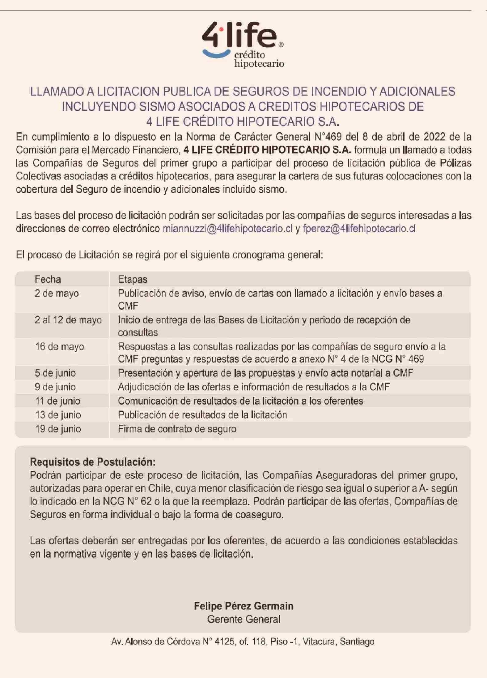 | Título: | AVISO LICITACIONES: LLAMADO A LICITACION PUBLICA DE SEGUROS DE INCENDIO Y ADICIONALES INCLUYENDO SISMO ASOCIADOS A CREDITOS HIPOTECARIOS DE 4 LIFE CRÉDITO HIPOTECARIO S.A. |