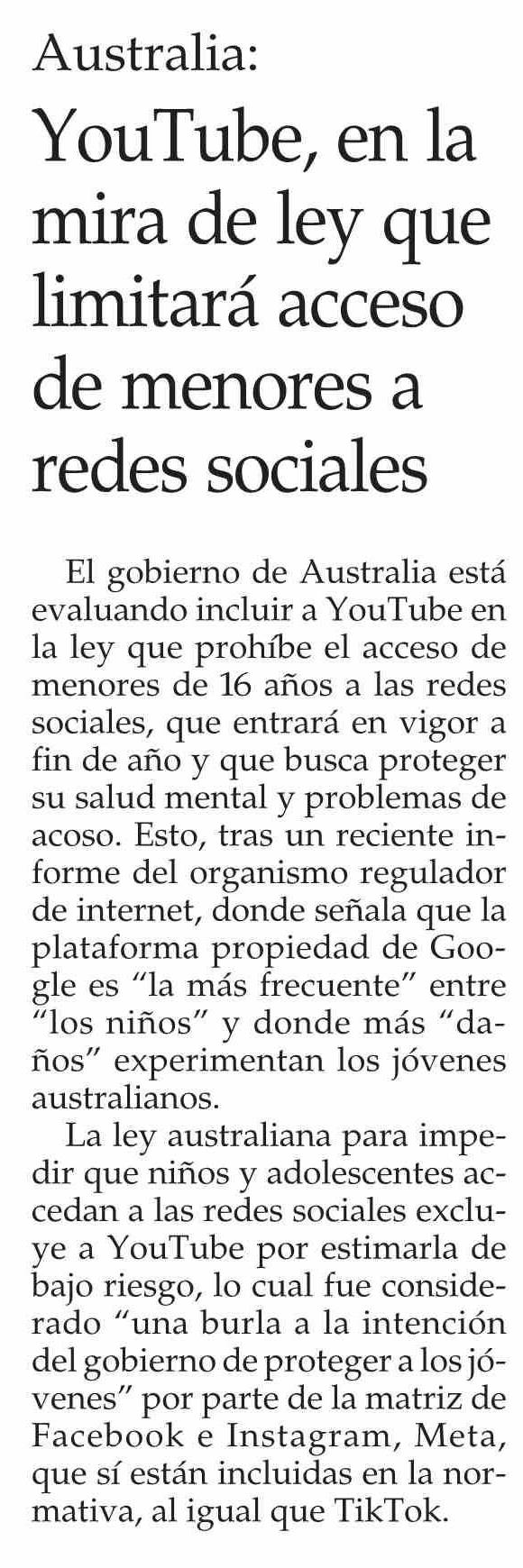 | Título: | YouTube, en la mira de ley que limitará acceso de menores a redes sociales |