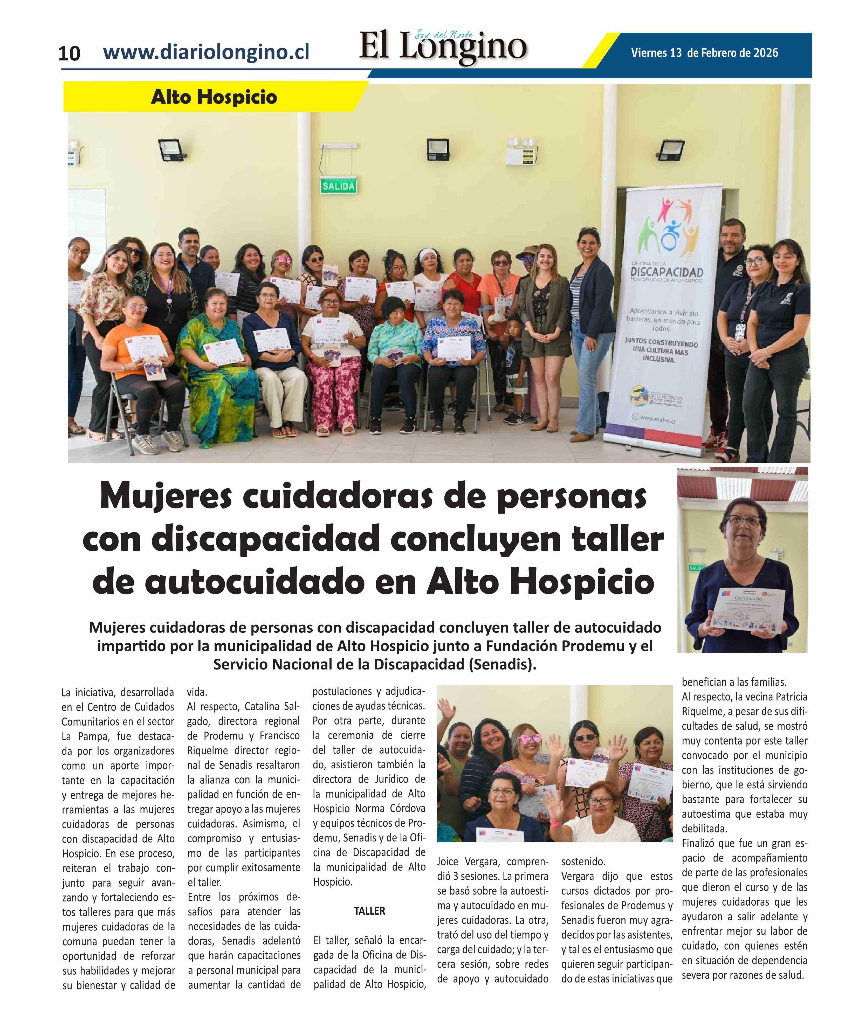 Mujeres cuidadoras de personas con discapacidad concluyen taller de autocuidado en Alto Hospicio 13-02-2026 El Longino |