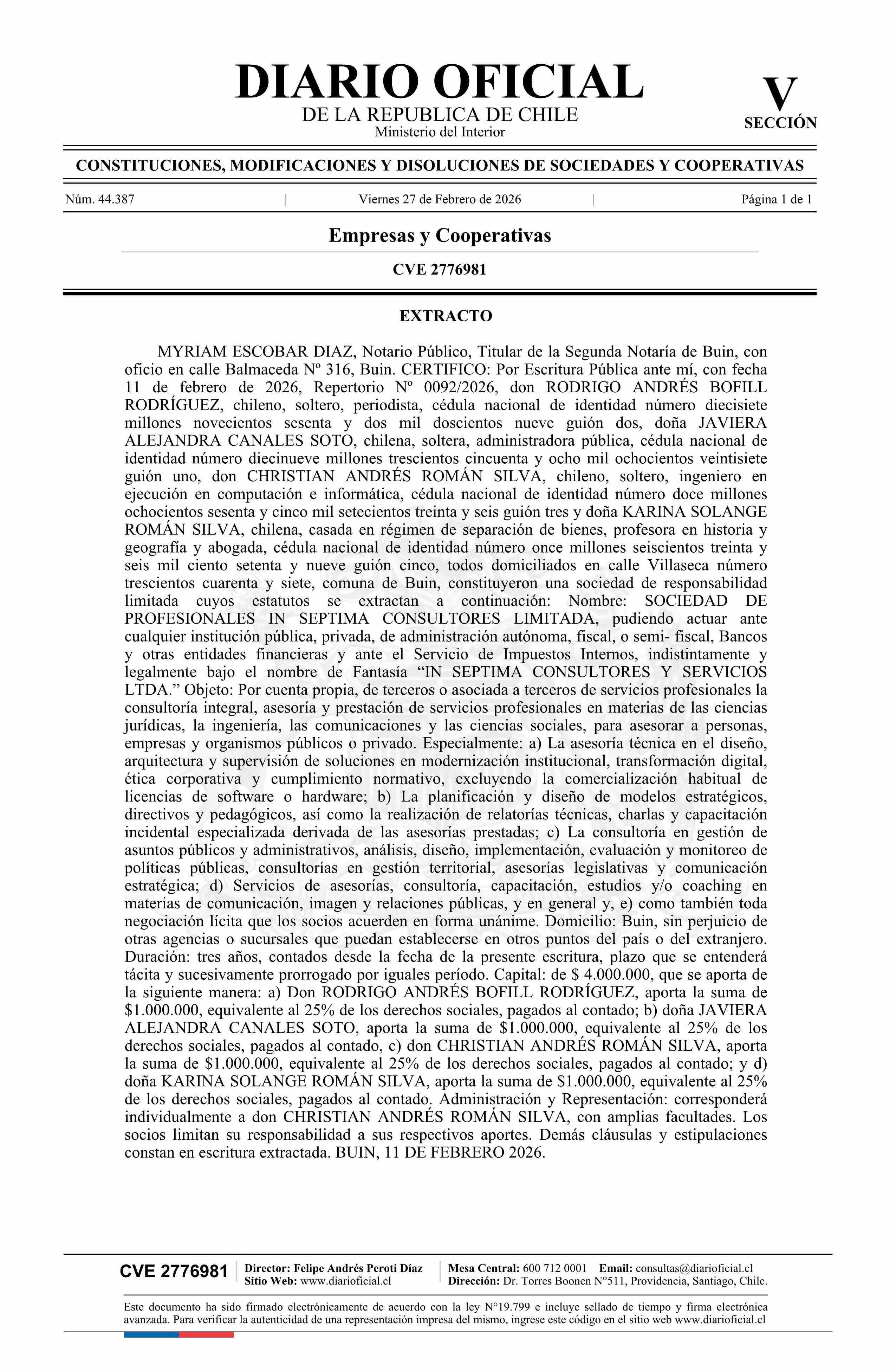 SOCIEDAD DE PROFESIONALES IN SEPTIMA CONSULTORES LIMITADA 27-02-2026 Diario Oficial Edición Electrónica |