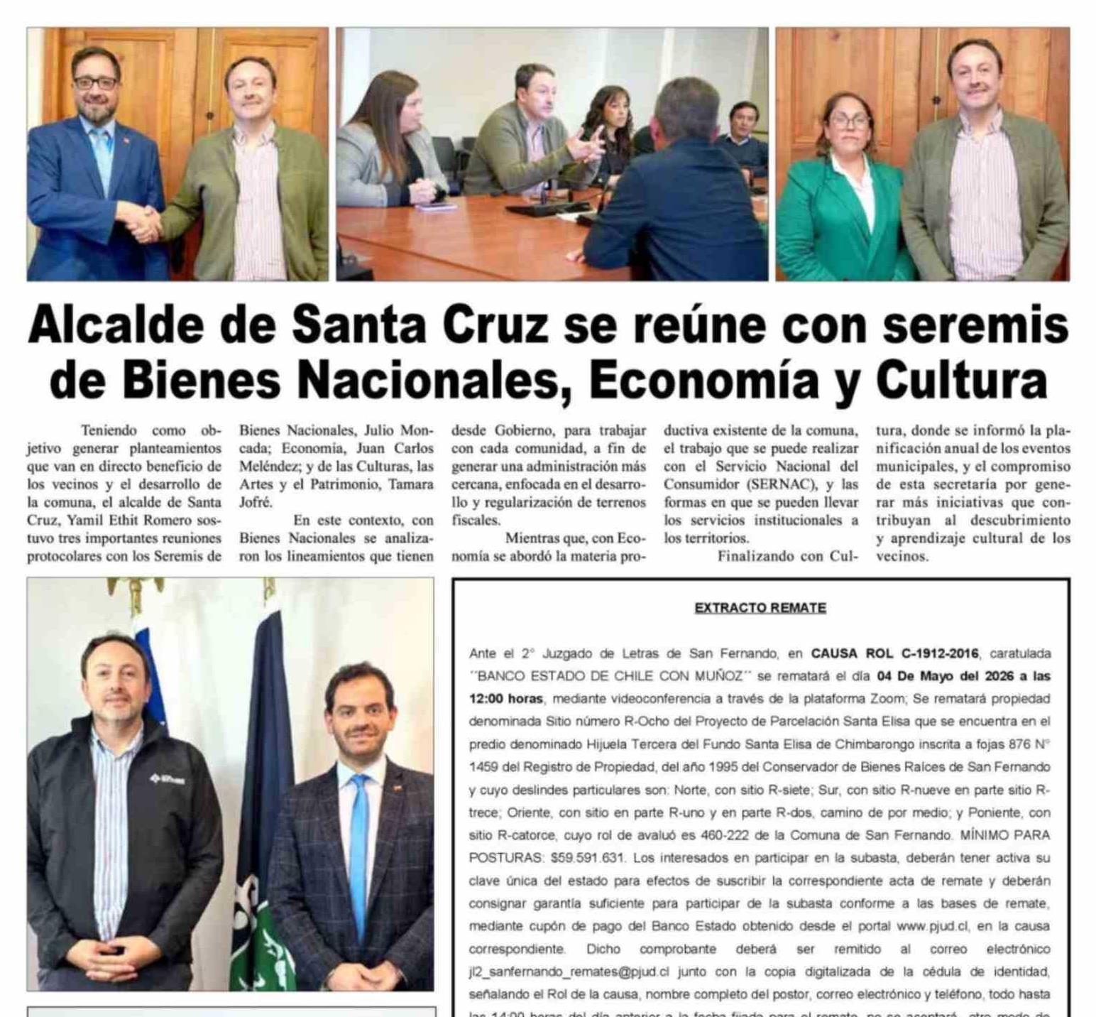 Alcalde de Santa Cruz se reúne con seremis de Bienes Nacionales, Economía y Cultura 16-04-2026 Diario VI Región |