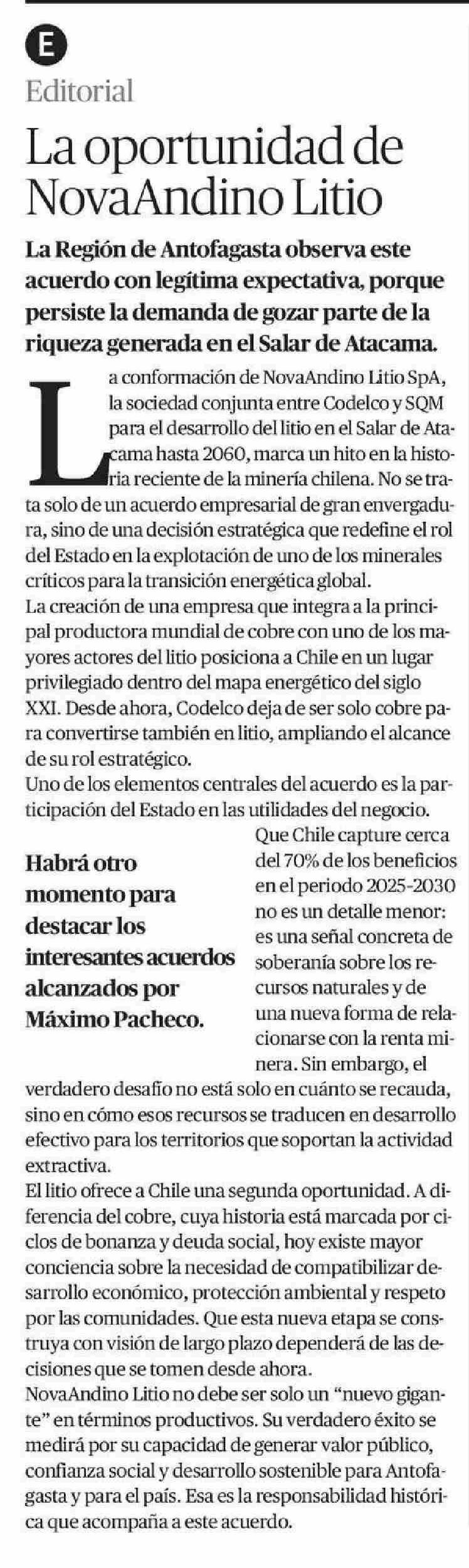 Editorial: La oportunidad de NovaAndino Litio 25-01-2026 El Mercurio de Calama |