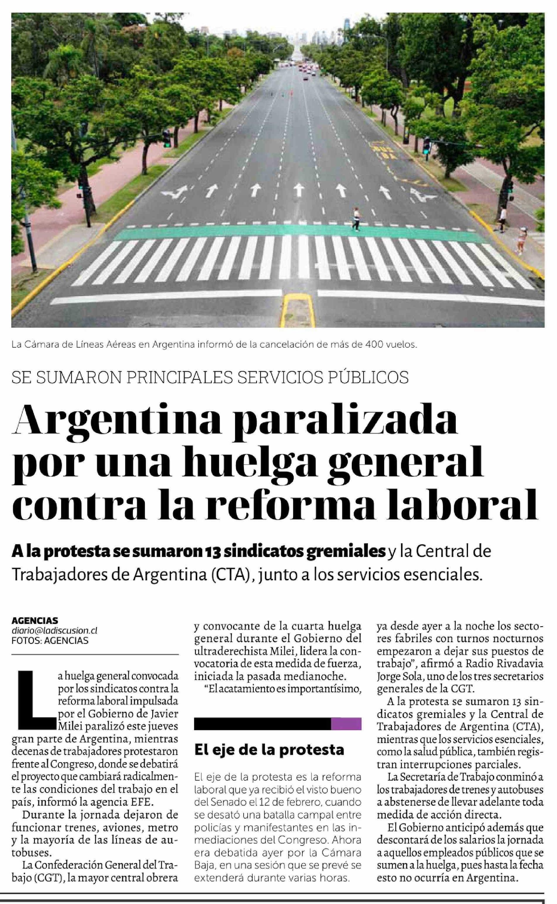 | Título: | Argentina paralizada por una huelga general contra la reforma laboral |