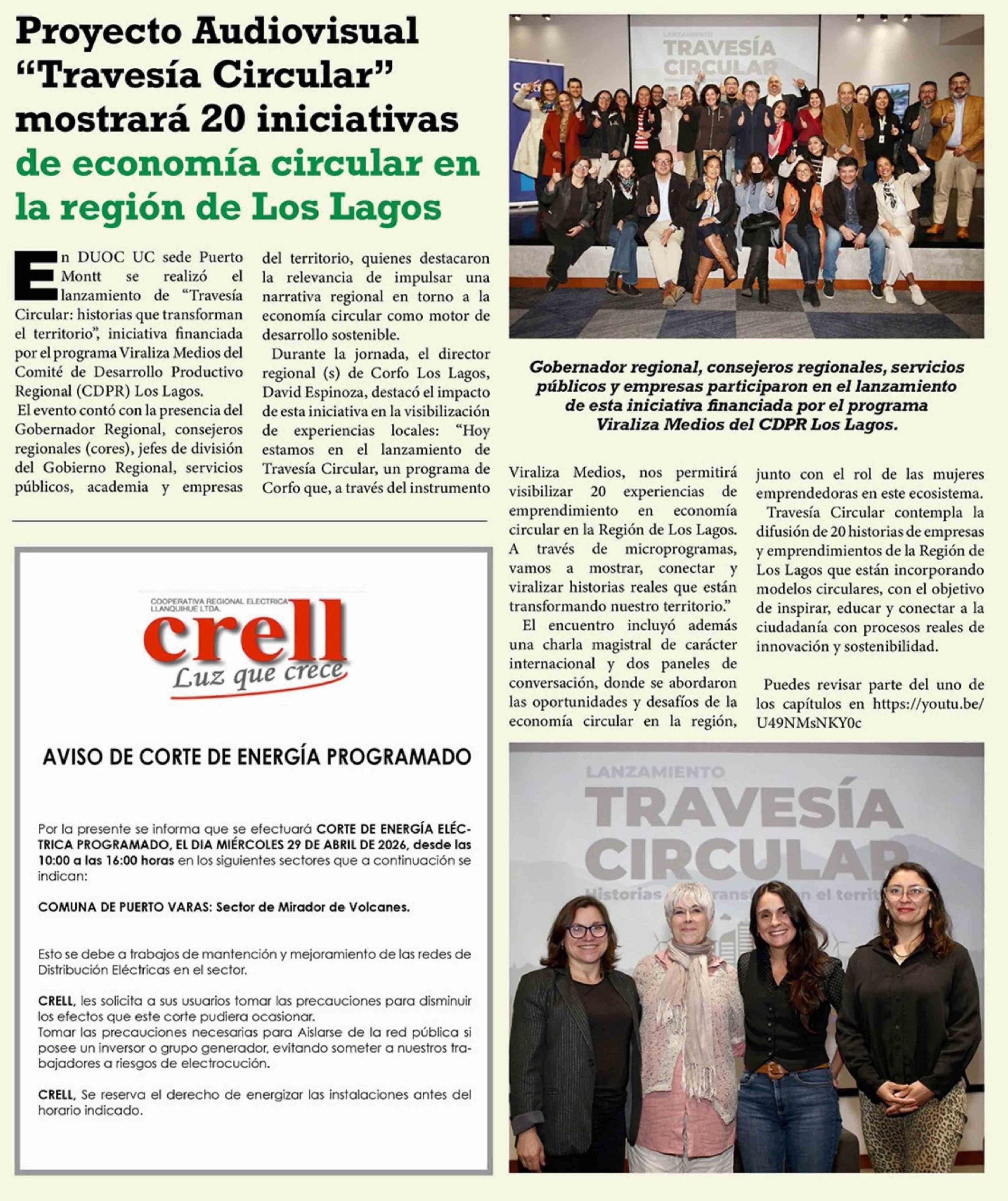 Proyecto Audiovisual "Travesía Circular" mostrará 20 iniciativas de economía circular en la región de Los Lagos 28-04-2026 El Heraldo Austral |