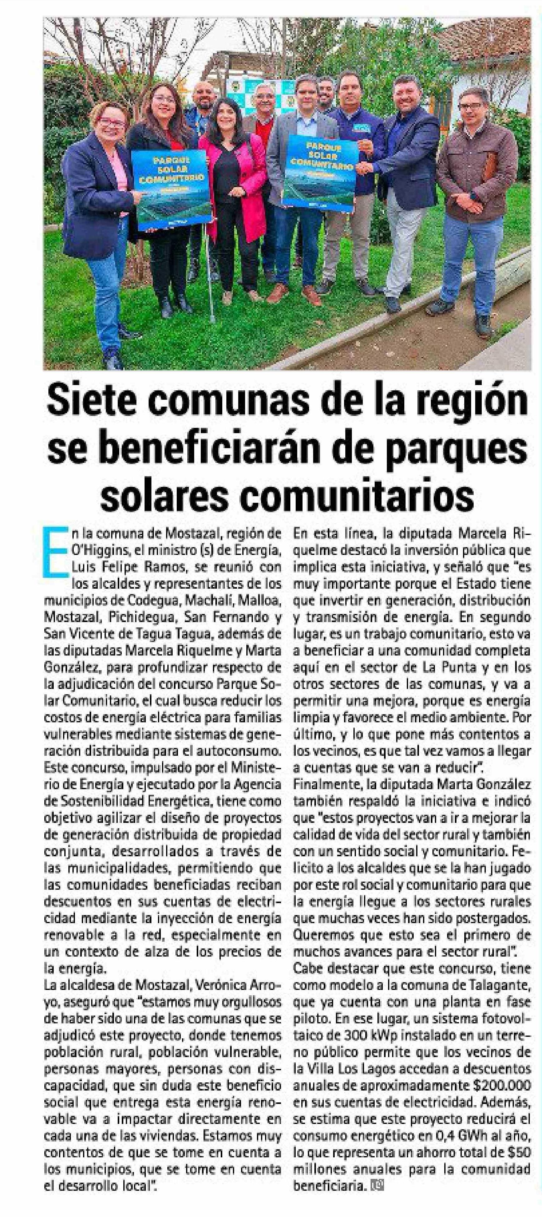 Siete comunas de la región se beneficiarán de parques solares comunitarios 26-05-2025 El Rancagüino |