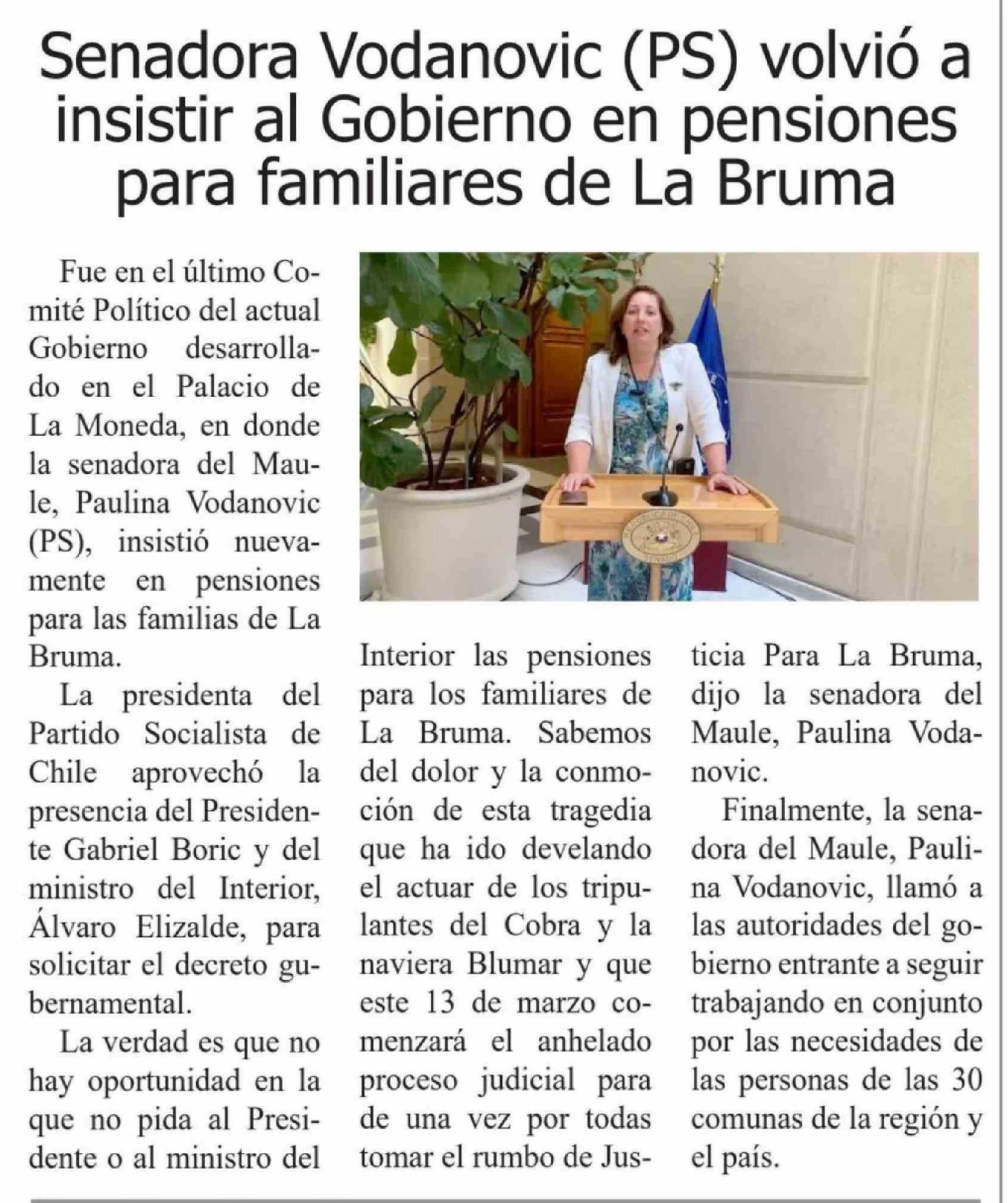 | Título: | Senadora Vodanovic (PS) volvió a insistir al Gobierno en pensiones para familiares de La Bruma |