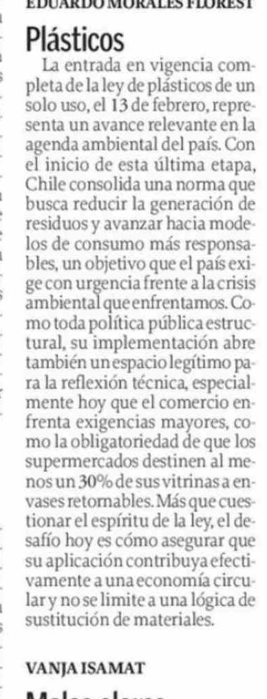 Título: Cartas: Plásticos La entrada en vigencia completa de la ley de plásticos de un solo uso, el 13 de febrero, representa un avance relevante en la agenda ambiental del país. Con el inicio de esta última etapa, Chile consolida una norma que busca reducir la generación de residuos y avanzar hacia modelos