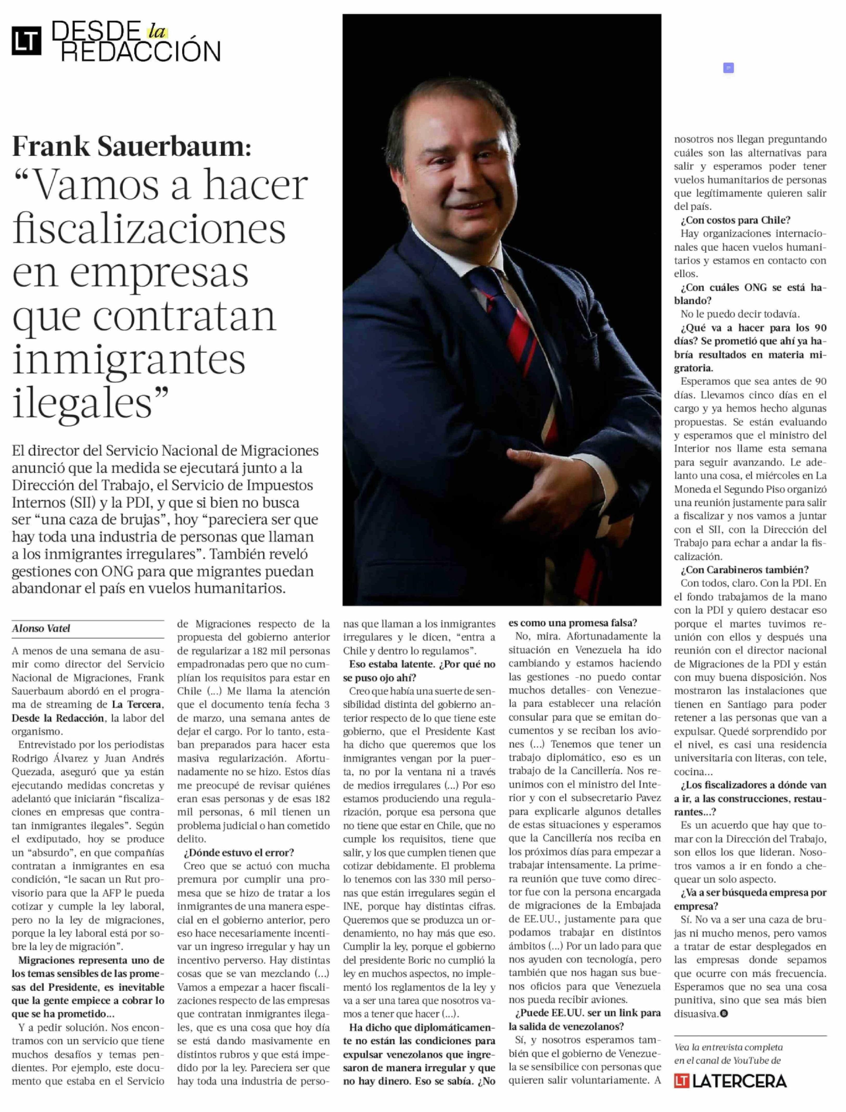 "Vamos a hacer fiscalizaciones en empresas que contratan inmigrantes ilegales" 31-03-2026 La Tercera |