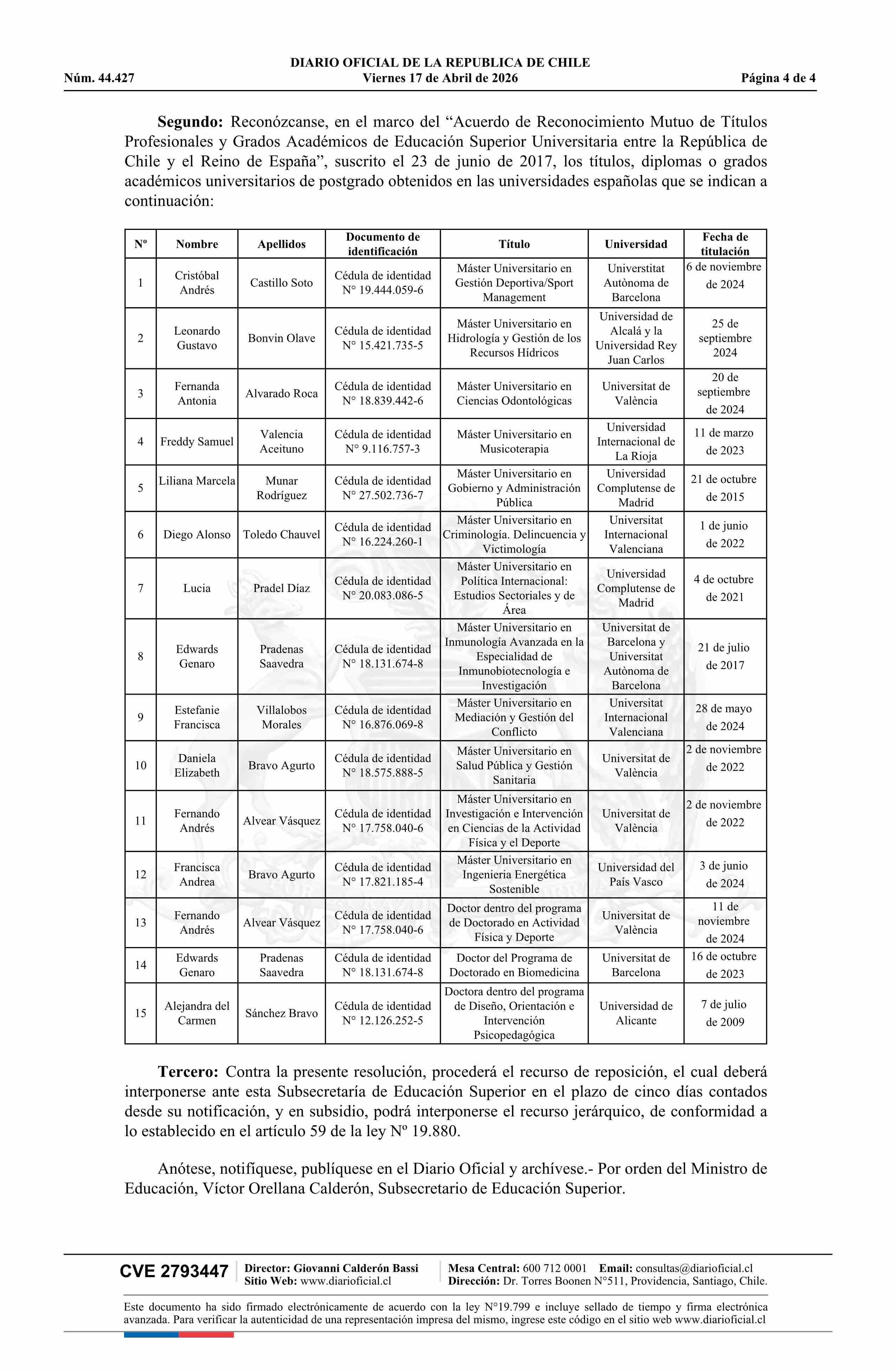 | Título: | Resolución exenta número 1.298, de 2026.- Reconoce títulos expedidos por universidades españolas que indica, en el marco del Acuerdo de Reconocimiento Mutuo de Títulos Profesionales y Grados Académicos de Educación Superior Universitaria entre la República de Chile y el Reino de España |