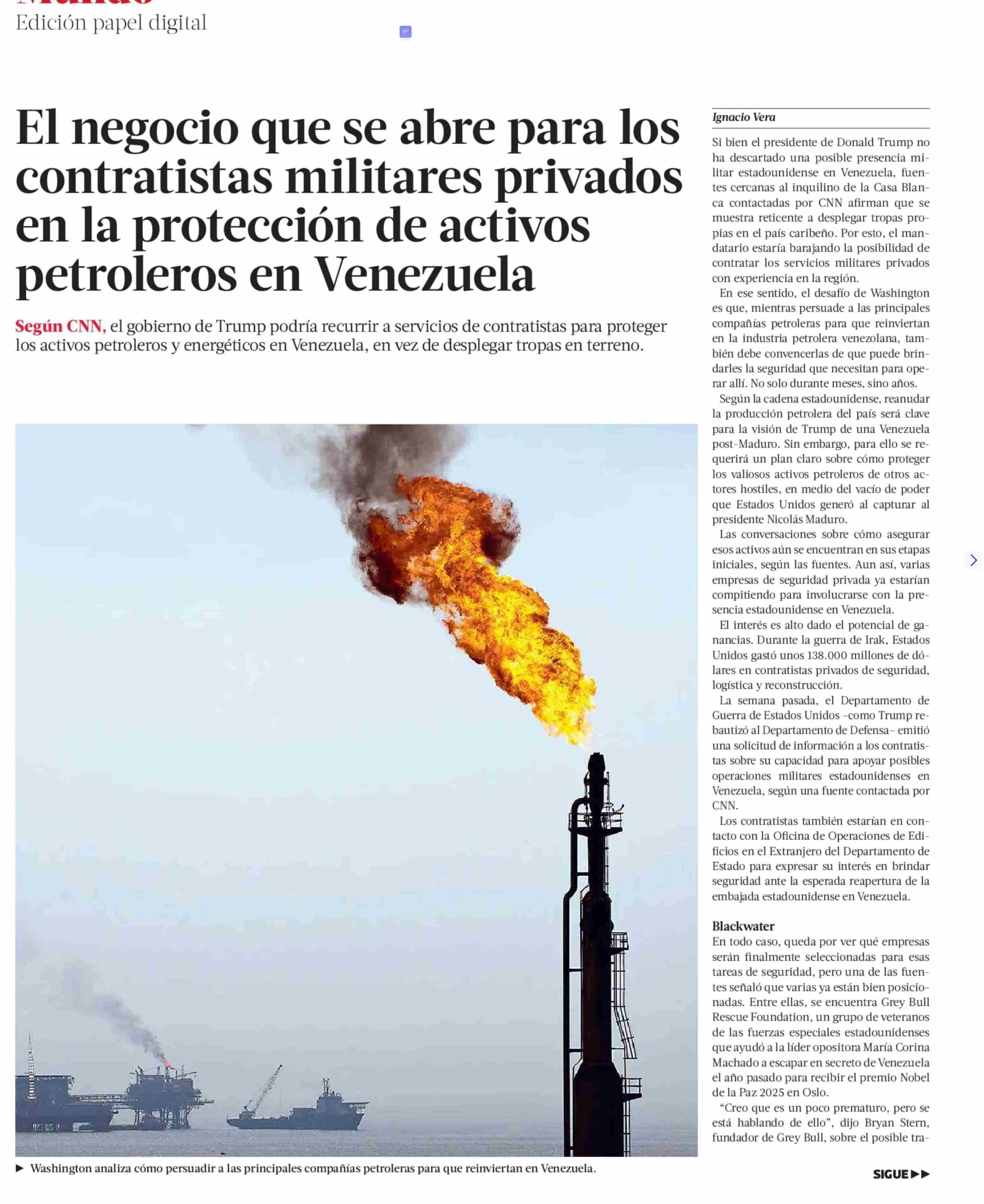 | Título: | El negocio que se abre para los contratistas militares privados en la protección de activos petroleros en Venezuela |
