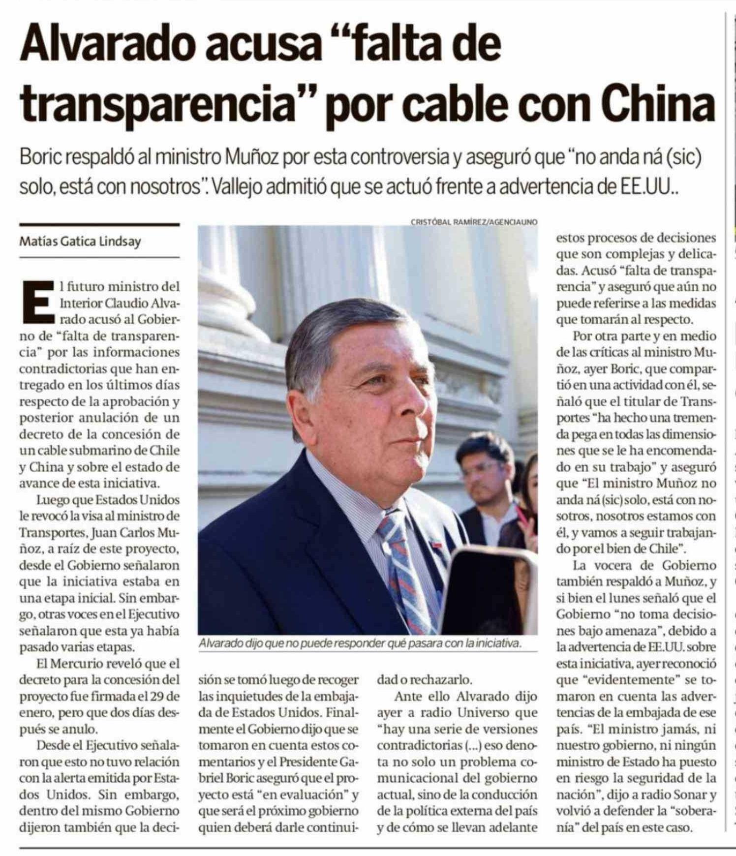 | Título: | Alvarado acusa "falta de transparencia" por cable con China |