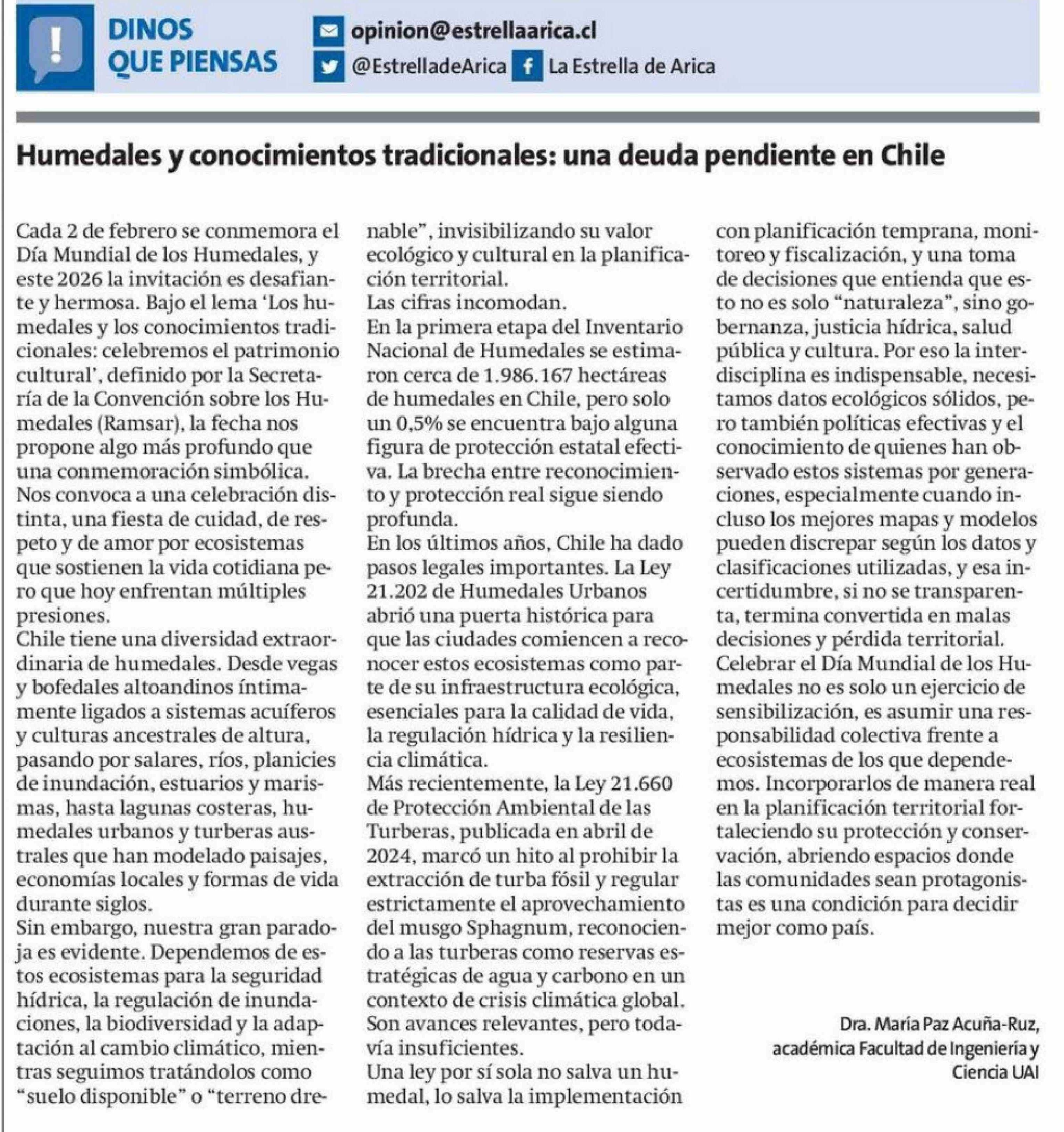 | Título: | Cartas: Cada 2 de febrero se conmemora el Día Mundial de los Humedales, y este 2026 la invitación es desafiante y hermosa. Bajo el lema 'Los humedales y los conocimientos tradicionales: celebremos el patrimonio cultural', definido por la Secretaría de la Convención sobre los Humedales (Ramsar), la f |